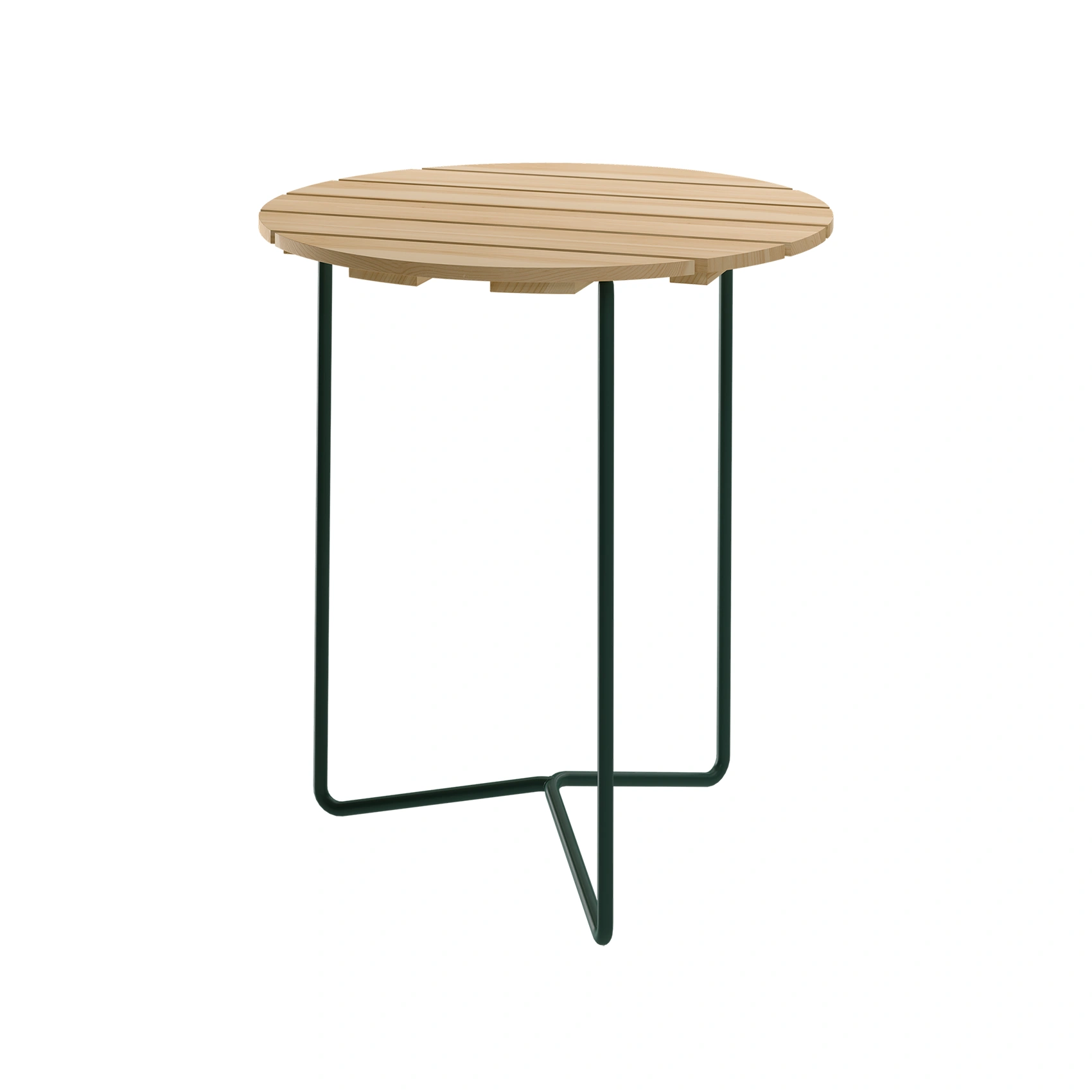 Stålstativet är lackerat i mörkgrönt (RAL 6012 GLS 72). Stativet är rostskyddsbehandlat innan lackering. Stålet kommer från återvunnet skrot som smälts ned. Det smälta stålet justeras till rätt blandning innan det görs till stänger och möbler.