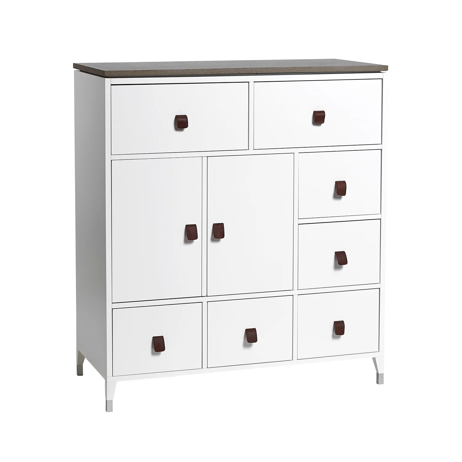 Abisko skänk med lådor och skåp. Finns i ”flerfanér” eller i vitlack, i flerfanér förekommer fanér av träslagen ask, valnöt körsbär och lönn. Byrån med topp i betong istället för MDF-topp som är standard.