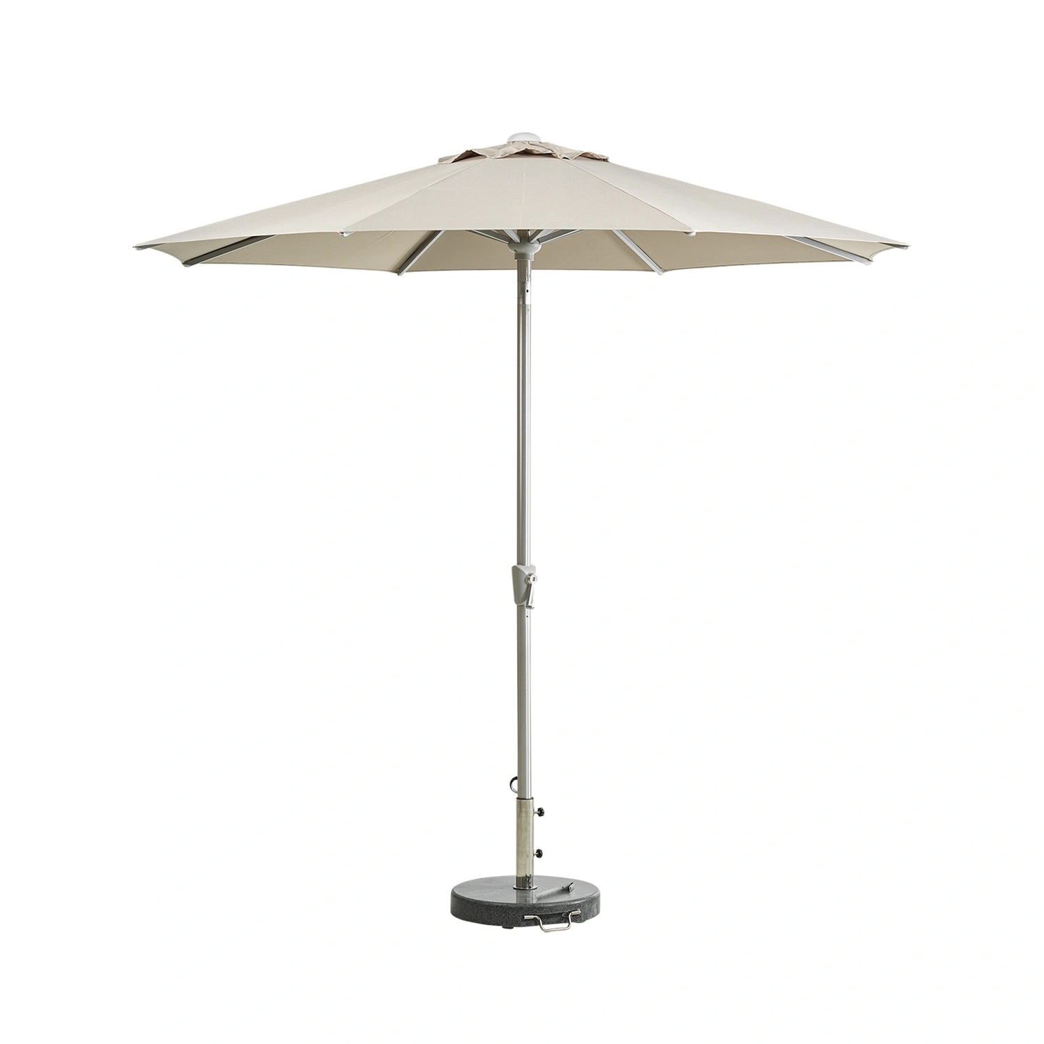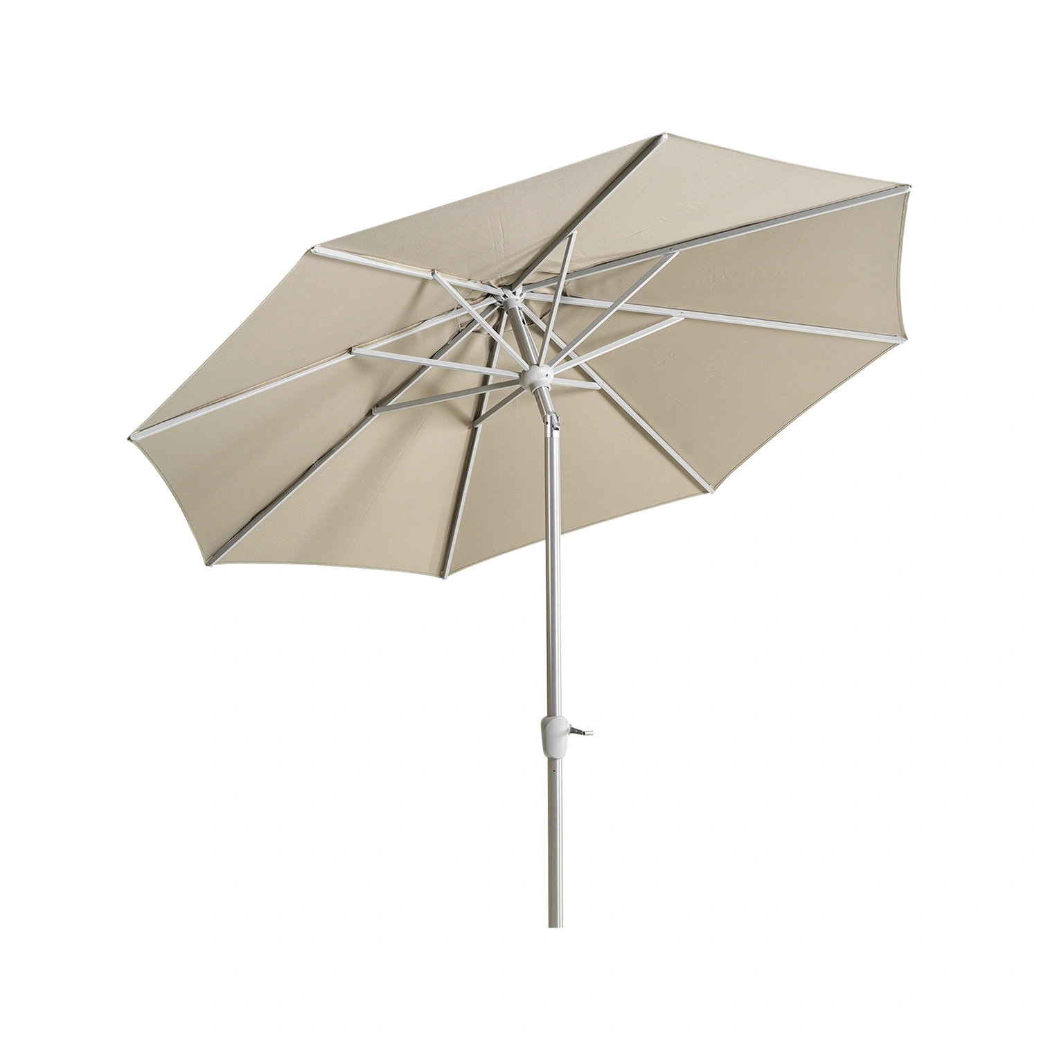 Abriola har en silverfärgad aluminiumstång i två delar med en diameter på Ø48 mm. Stången är utrustad med en vev och en automatisk tiltfunktion, vilket gör det enkelt att vinkla parasollen. Parasollens tak är tillverkat av 250-grams genomfärgat tyg, komplett med en ventilationsöppning, och stöds av 8 ribbor.