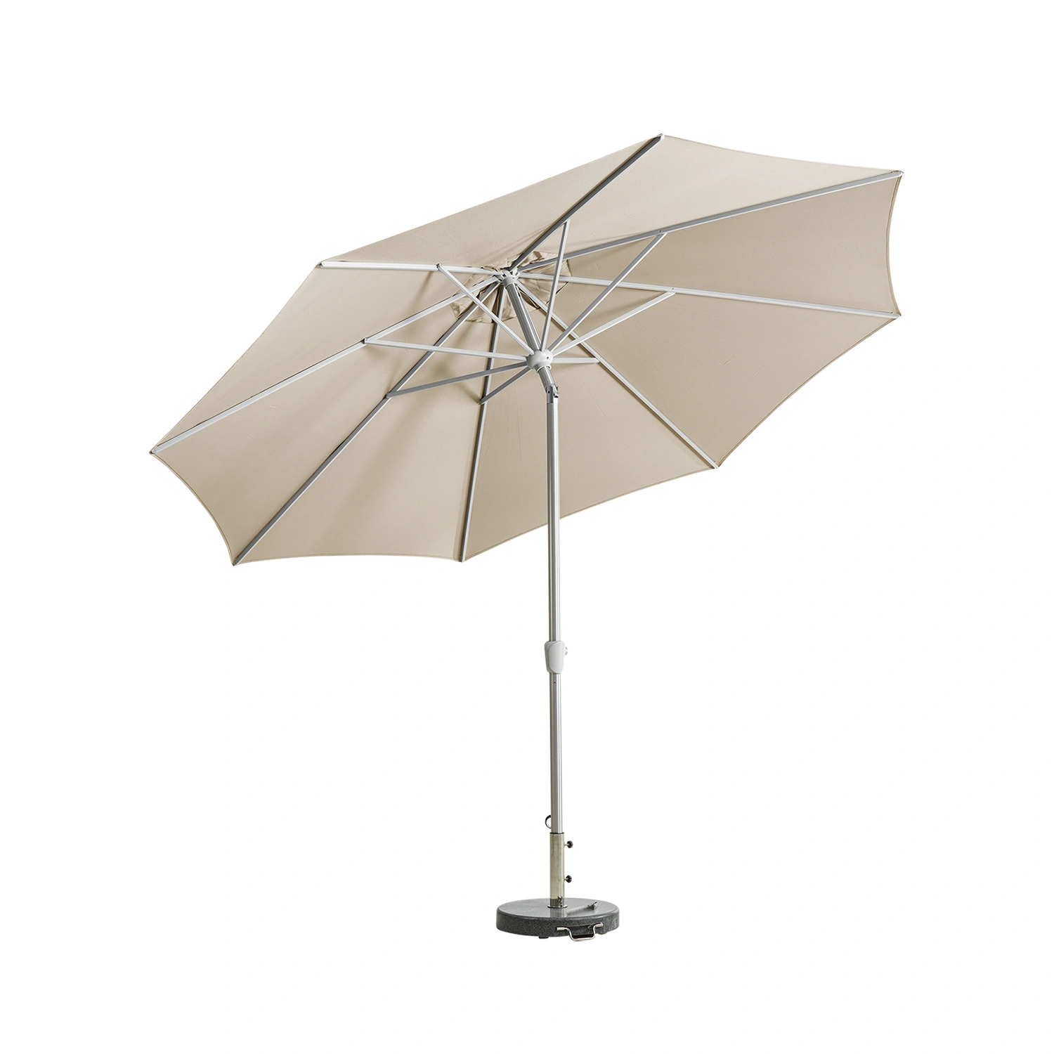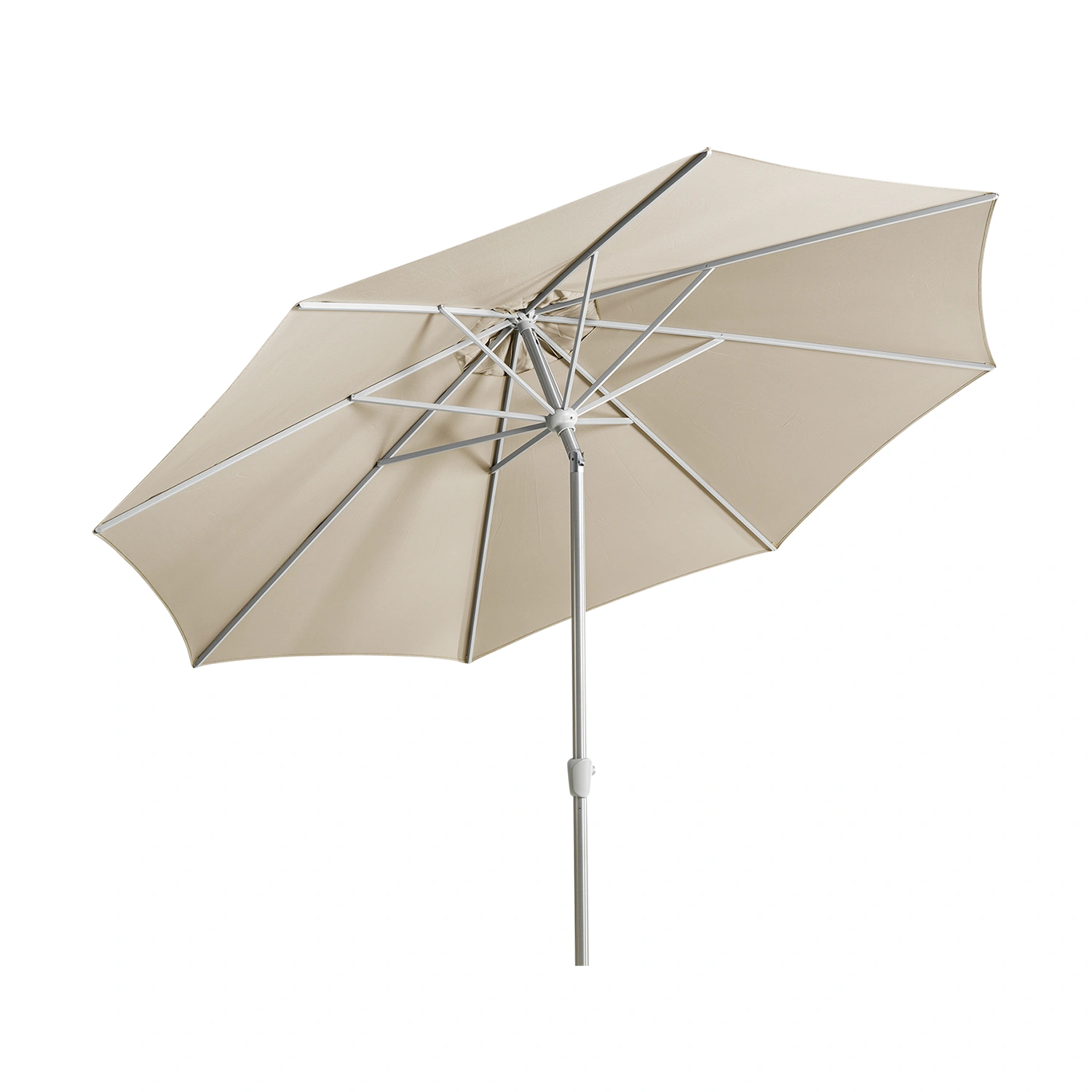 Abriola har en silverfärgad aluminiumstång i två delar med en diameter på Ø48 mm. Stången är utrustad med en vev och en automatisk tiltfunktion, vilket gör det enkelt att vinkla parasollen. Parasollens tak är tillverkat av 250-grams genomfärgat tyg, komplett med en ventilationsöppning, och stöds av 8 ribbor.
