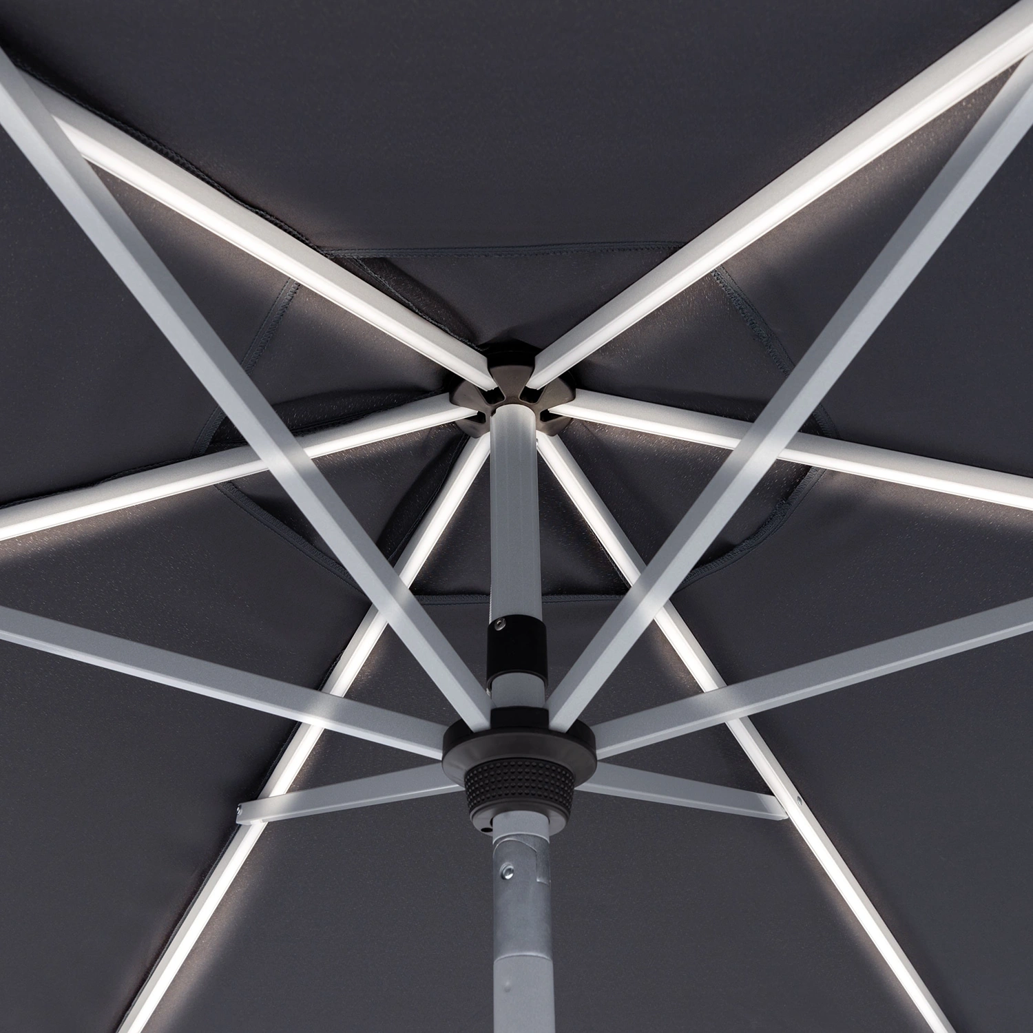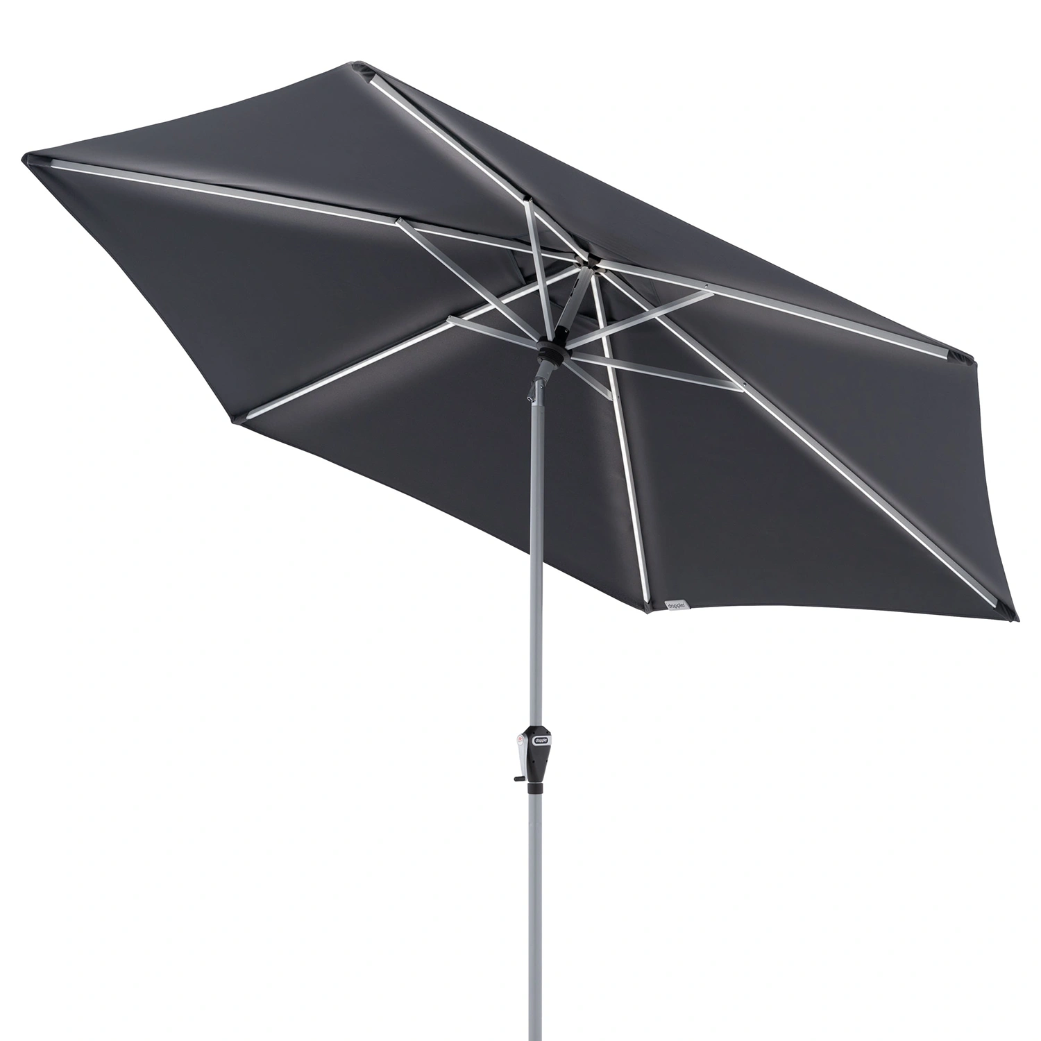 Active AutoTilt LED parasoll är ett modernt och funktionellt parasoll. Ett trädgårdsparasoll för det speciella ögonblicket. Imponera på dina gäster och låt ditt paraply lysa i mörkret vid nästa grillfest. Paraplyet är utrustat med 6 LED-ljuslister på de långa ribborna, som kan slås på med en strömbrytare på ramen.