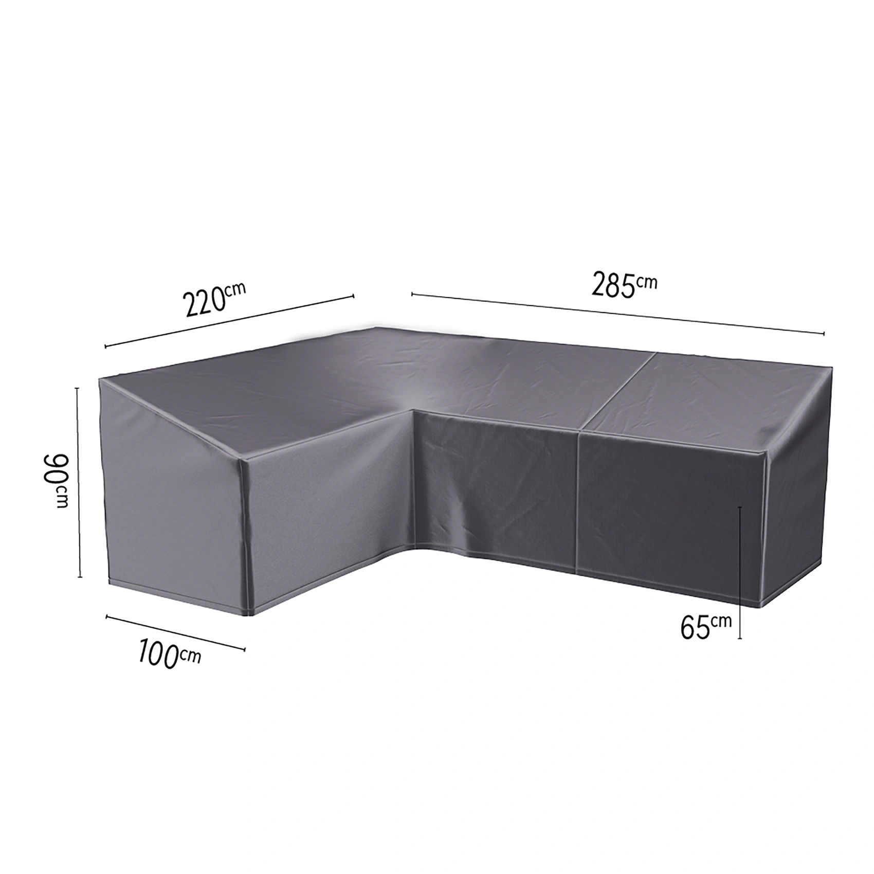 Detta möbelskydd är framtaget för att passa L-formade soffor som är högre i bakkant. Det här skyddet passar till soffor som är längre till vänster när du sitter i soffan. Bredden till vänster är 285 cm och längden till höger är 220 cm. Djupet är 100 cm och höjden är 90 cm i ryggen.