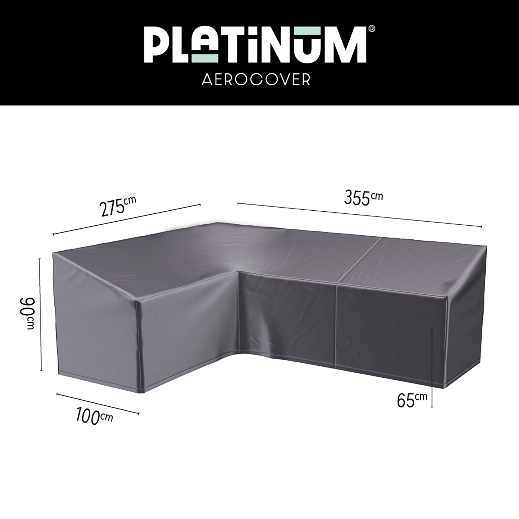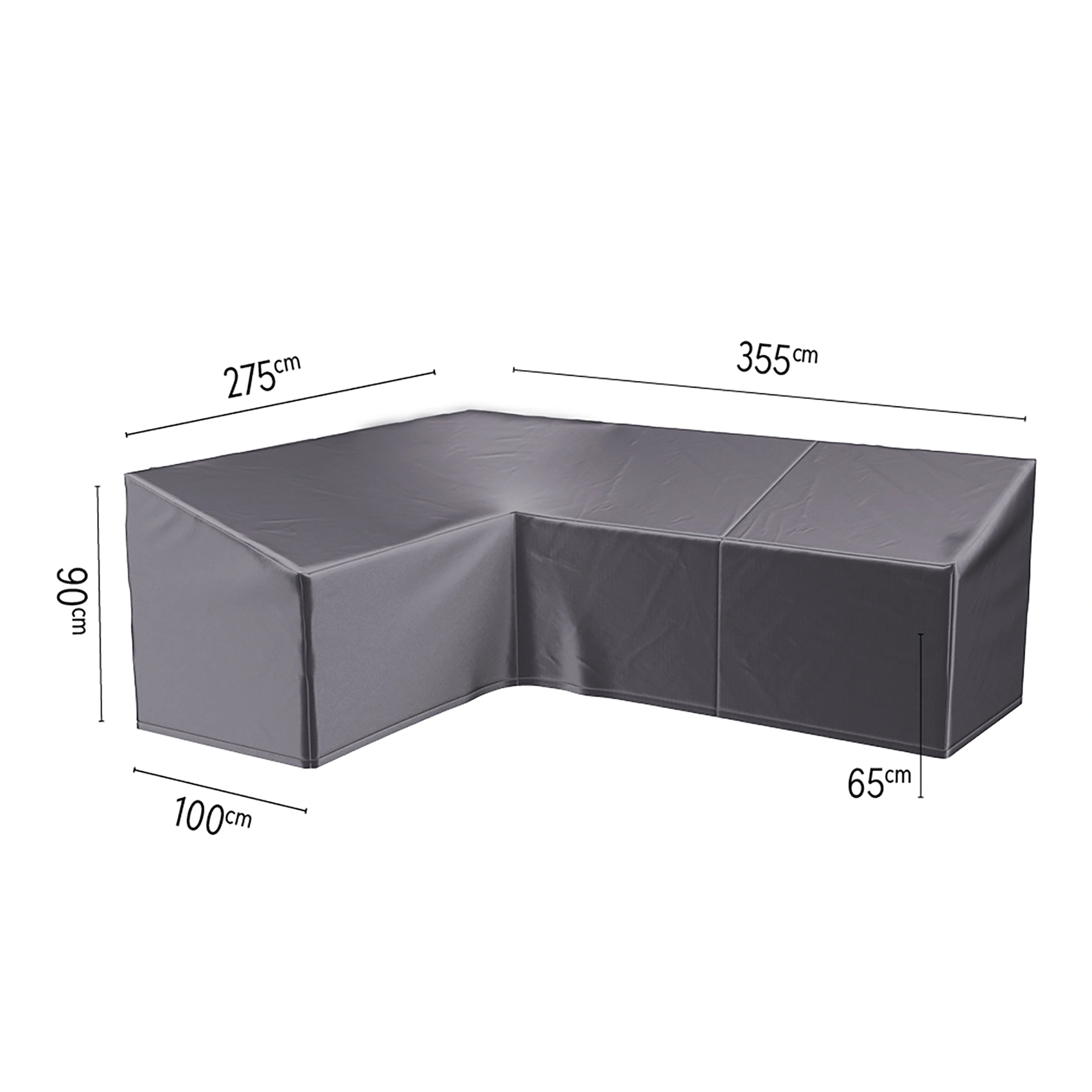 Detta möbelskydd är framtaget för att passa L-formade soffor som är högre i bakkant. Det här skyddet passar till soffor som är längre till vänster när du sitter i soffan. Bredden till vänster är 355 cm och längden till höger är 275 cm. Djupet är 100 cm och höjden är 90 cm i ryggen.