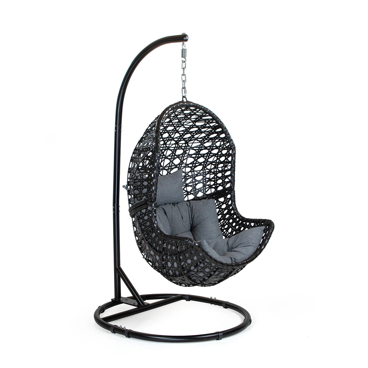 Ägget är en bekväm och stilren hänggunga med plats för en person, utformad för att erbjuda en lugn stund i trädgården eller på uteplatsen. Gungan har en omslutande form i svart konstrotting och är utrustad med generösa, fluffiga dynor i grått olefintyg som ger både komfort och ett mjukt uttryck. Den delbara konstruktionen gör gungan enkel att hantera vid montering och förvaring.