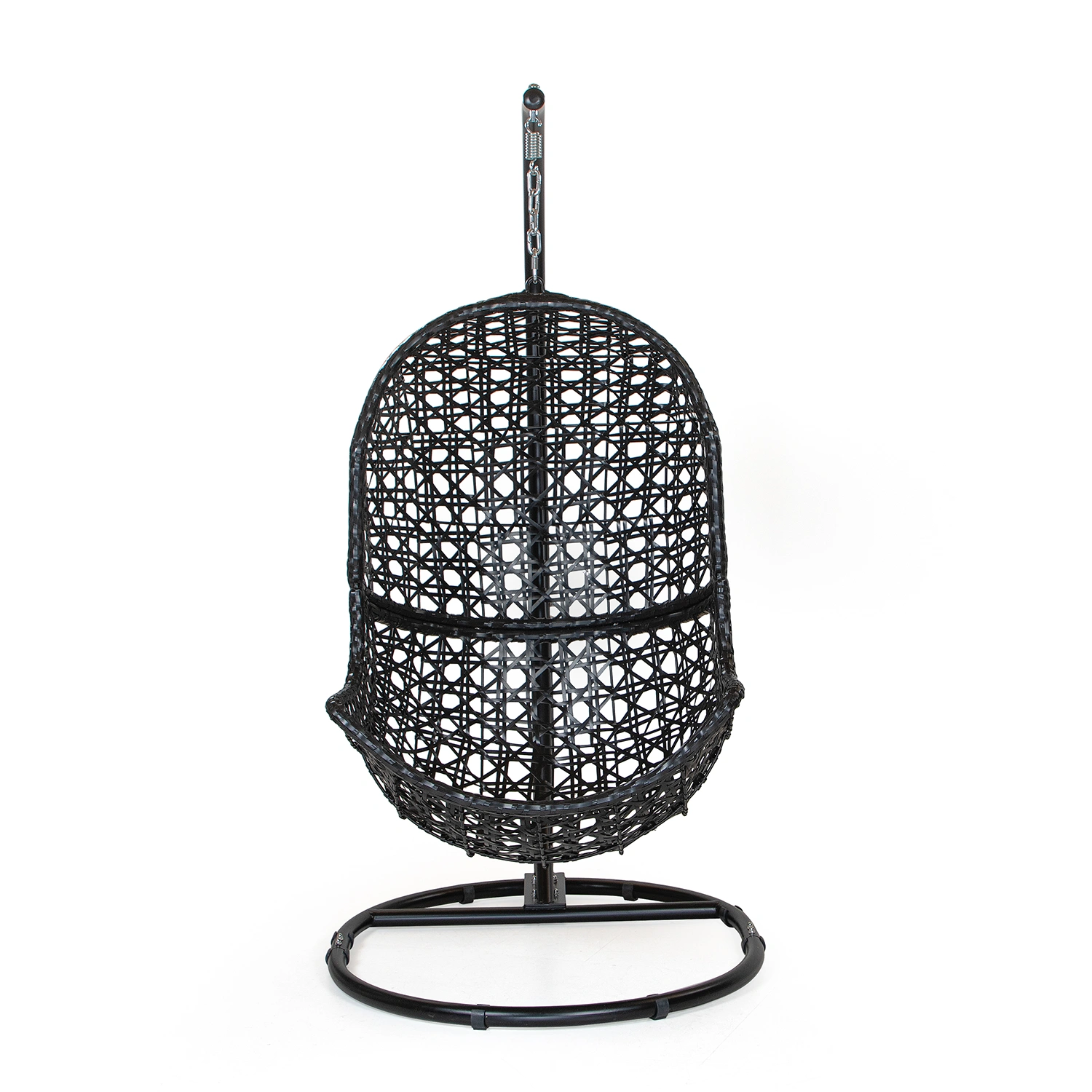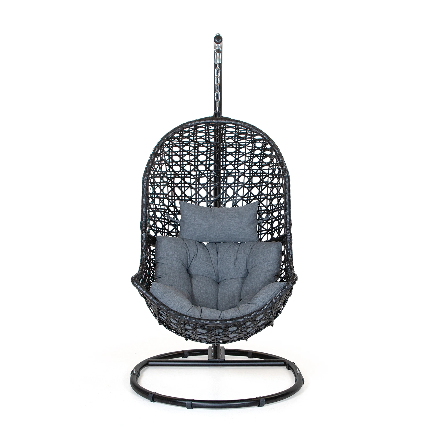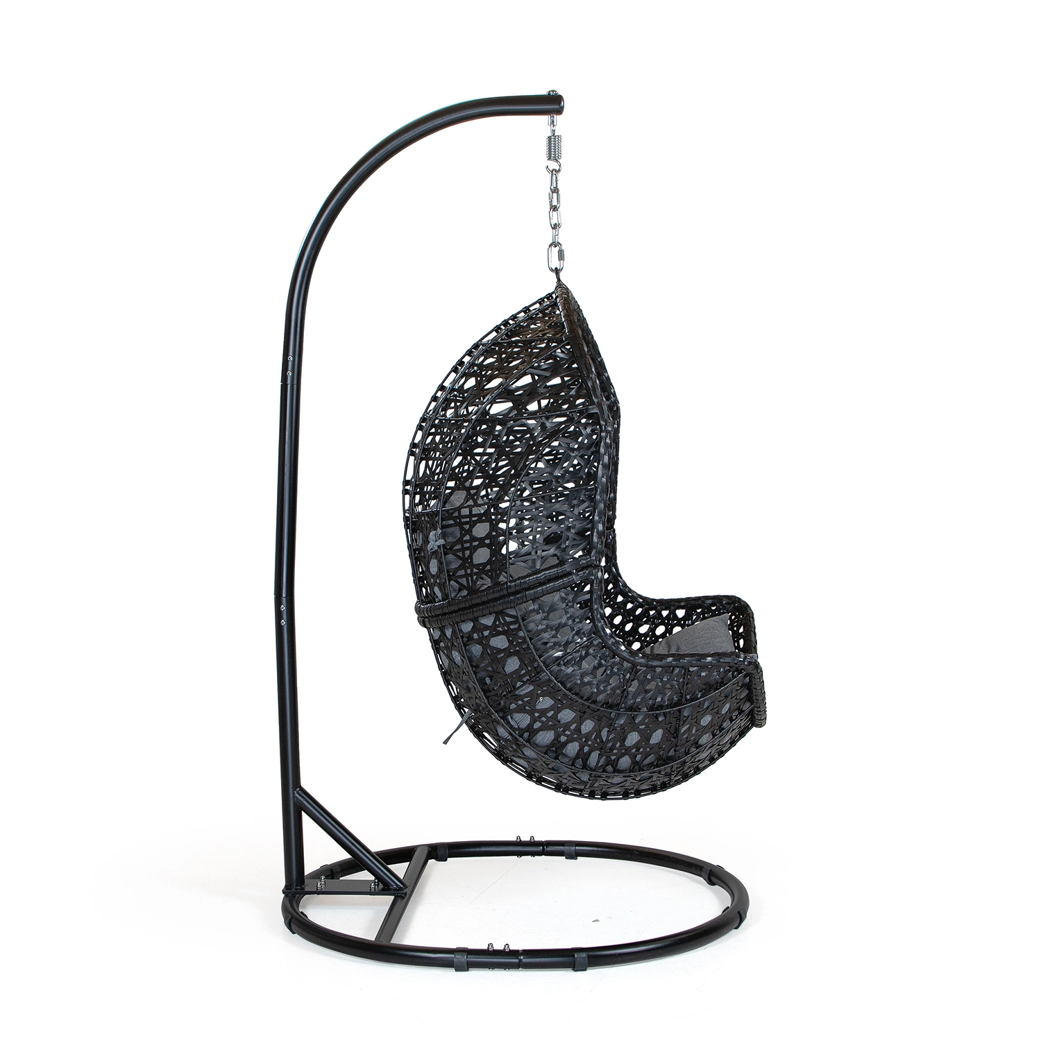 Stativet är tillverkat i svartlackerat stål och ger stabilitet till hela upphängningen. Ägget levereras omonterad, vilket underlättar transport och förvaring. Den grafiska färgsättningen i svart och grått gör gungan lätt att kombinera med olika utemiljöer – från moderna trädgårdar till mer klassiska terrasser.