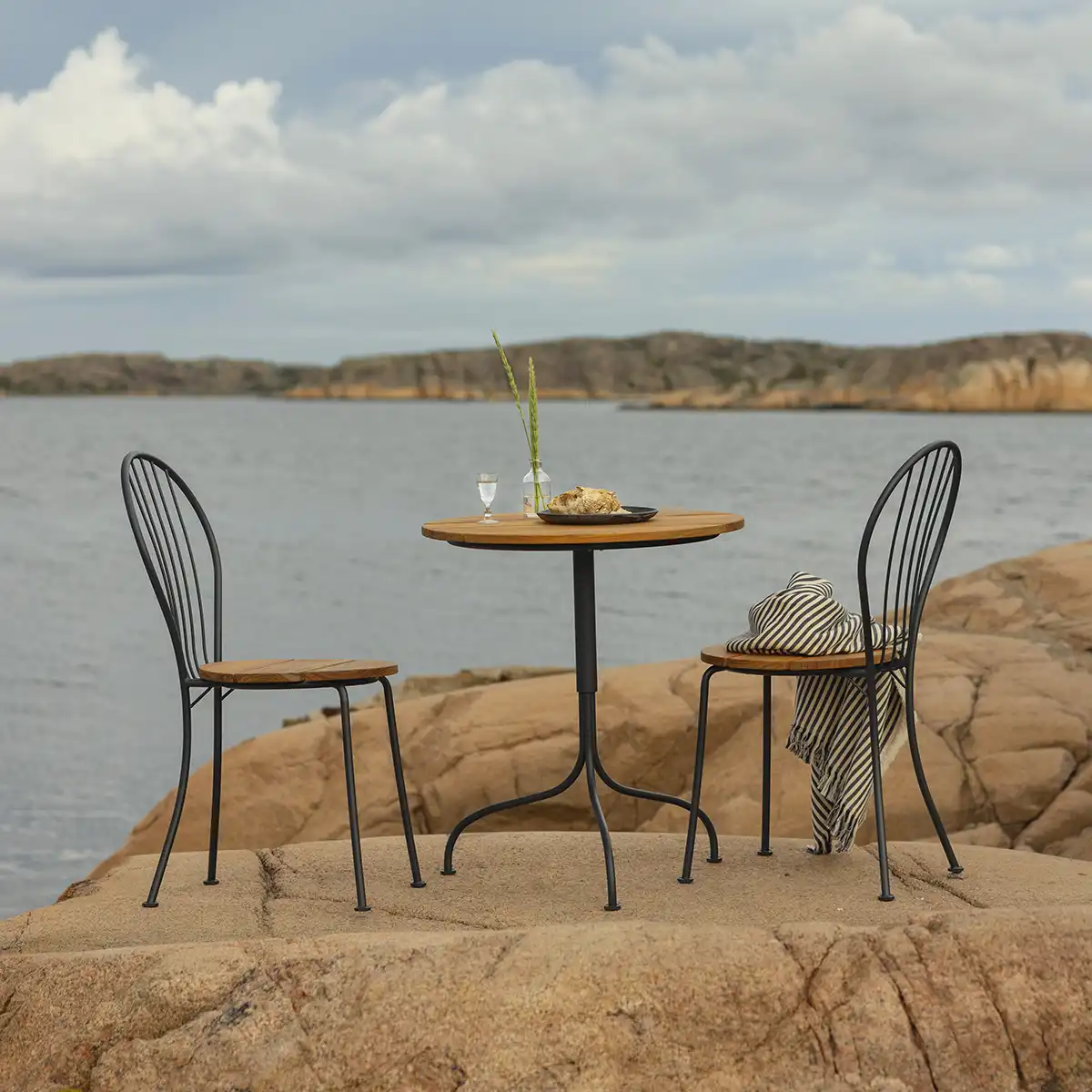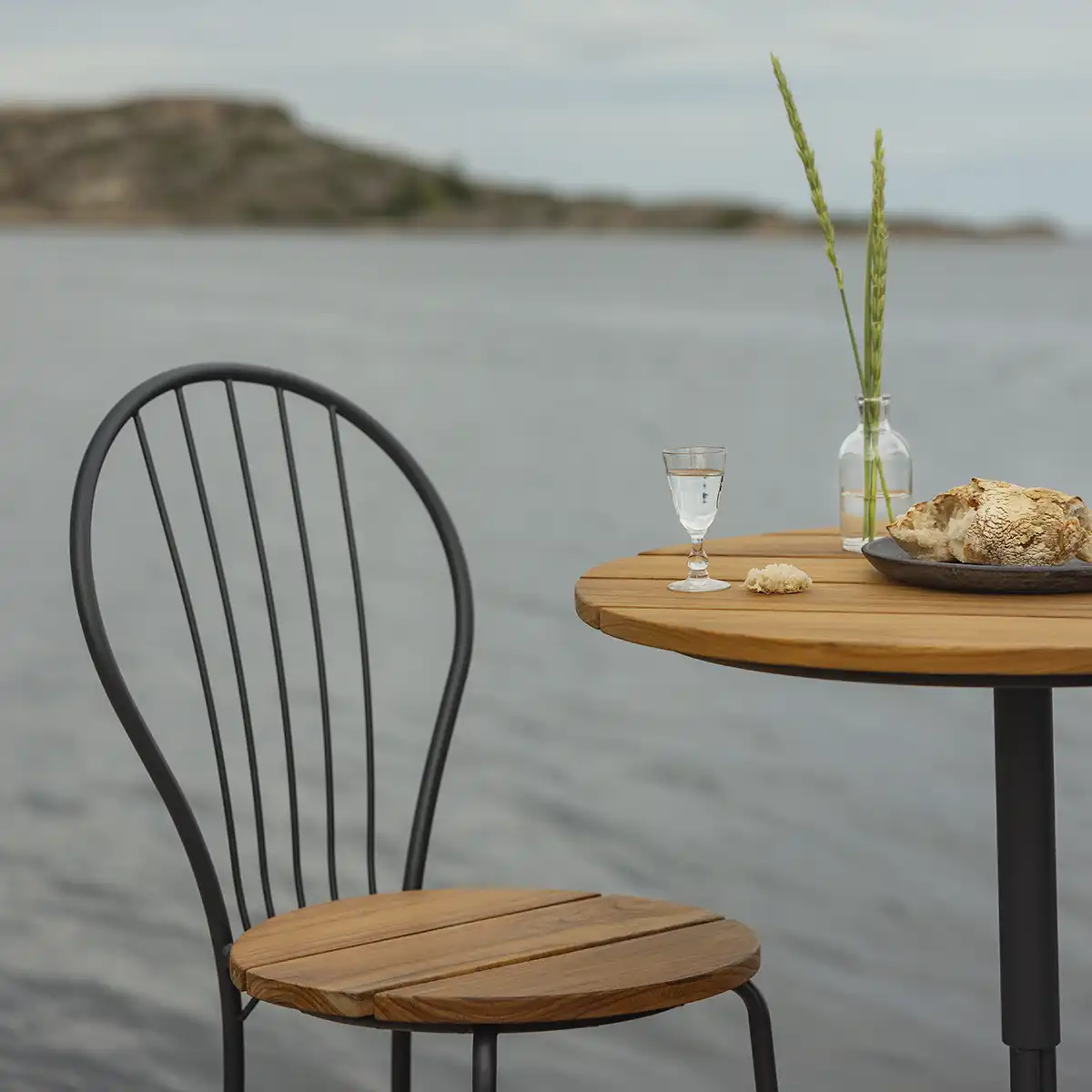 De runda formen sätter sin prägel på cafégruppen Akleja. Trädetaljerna i obehandlad teak bärs upp av de stadiga benen och de runda tassarna. Akleja-serien har tagits fram i samarbete med formgivaren Jonas Bohlin.