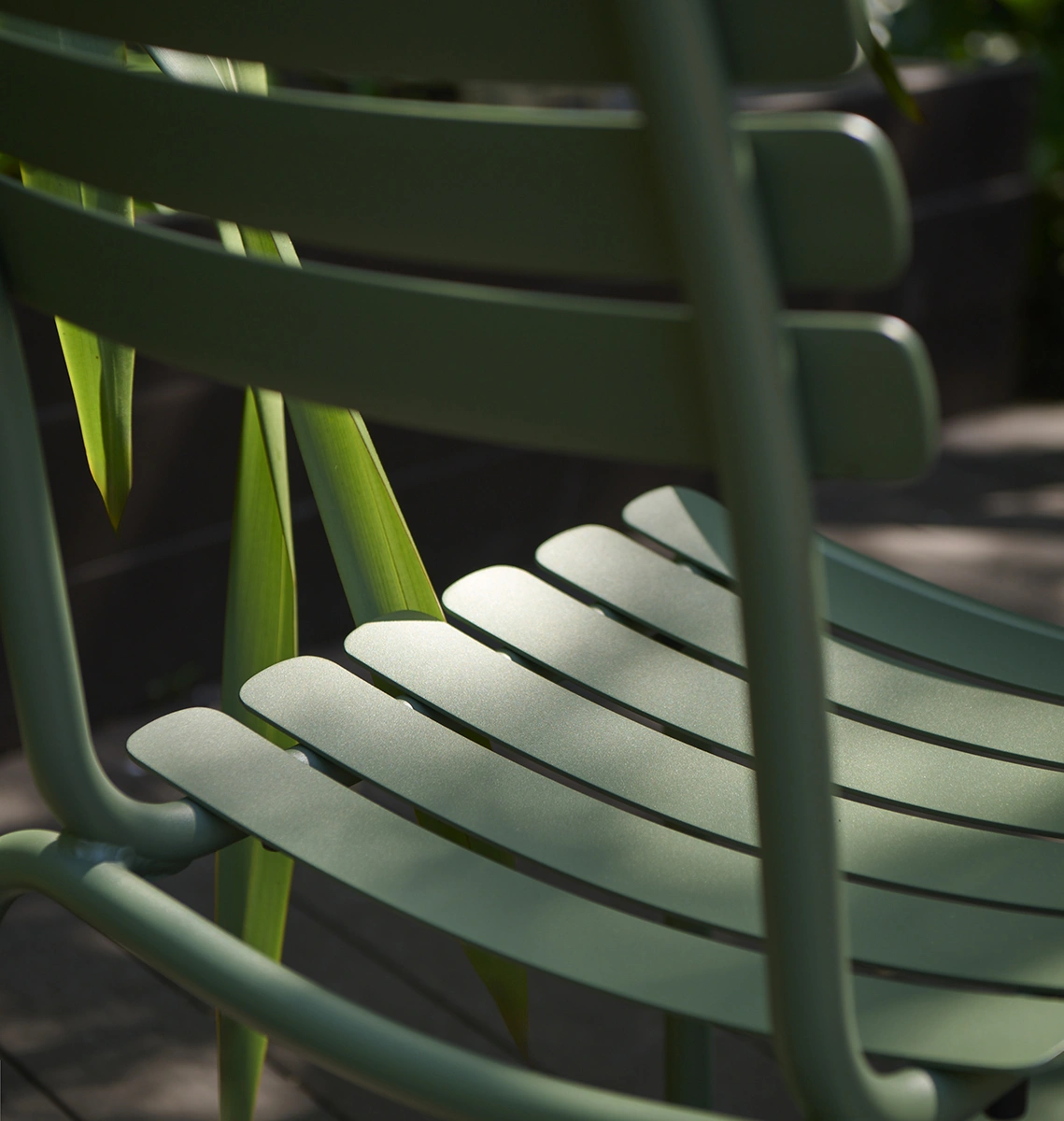 De böjda aluminiumlamellerna är formade för att ge dig en bekväm sittupplevelse och ge stolen ett mjukt och inbjudande utseende. Designad och producerad med hållbarhet i åtanke, Alua är byggd för att tåla många år utomhus – och kommer med en 5-års garanti.
