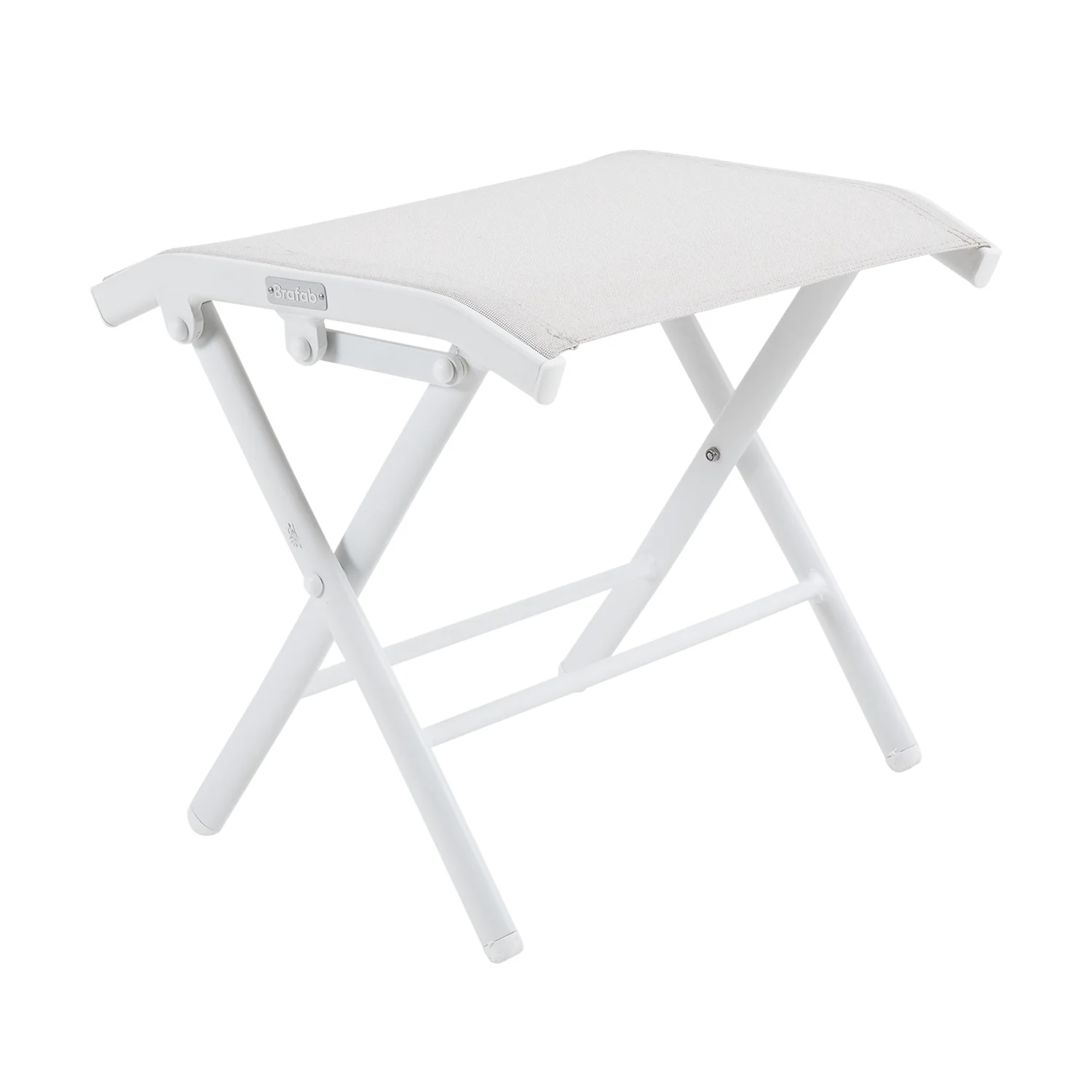 Andy fotpall är hopfällbar och tillverkad i matt vit aluminium, sits i vädertålig offwhite textilen, rostfria skruvar och beslag.