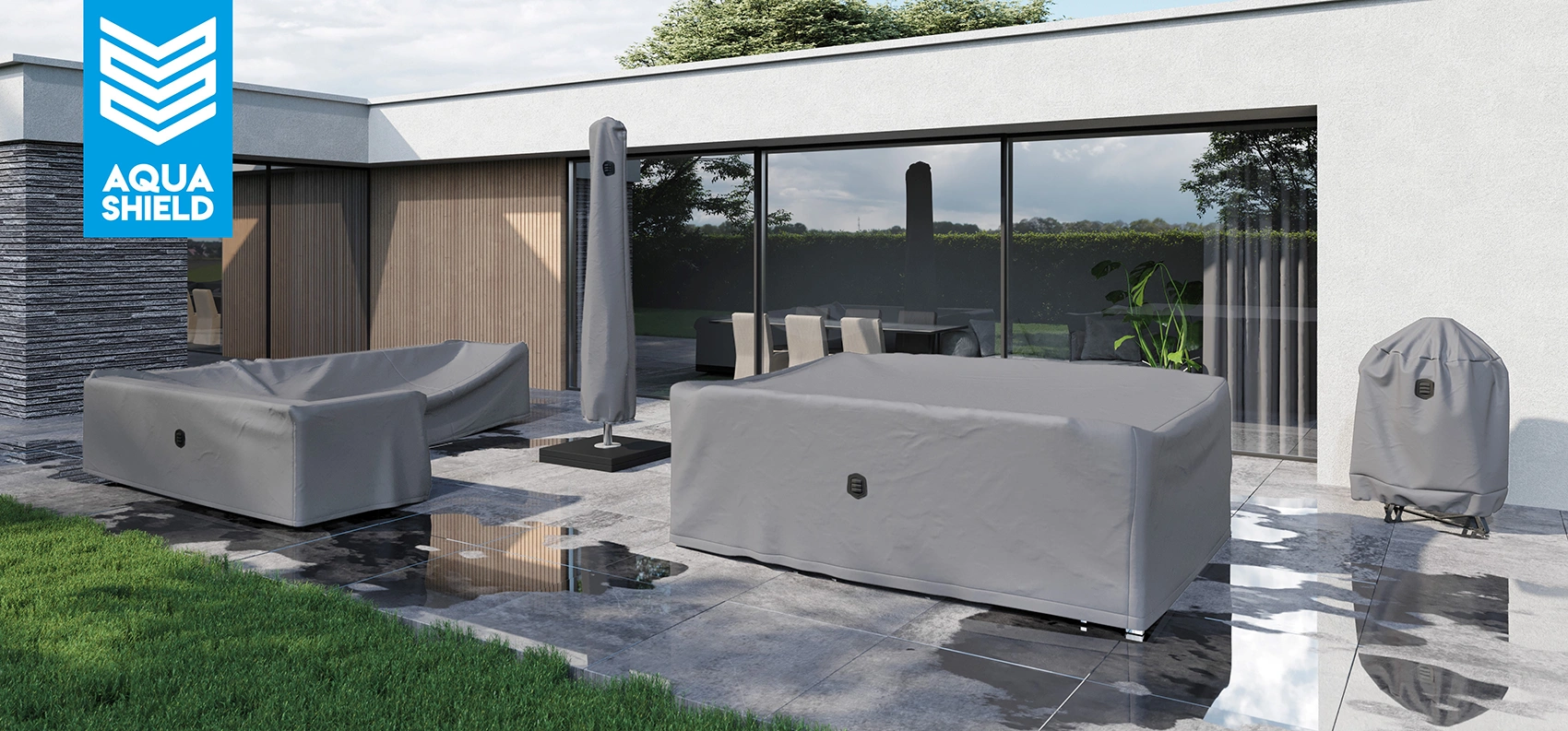 Skydda ditt parasoll mot regn, smuts och sol och ge den längre livslängd genom att använda ett parasollskydd. Dragskor i skyddets nederdel gör att det sitter på plats och inte blåser av. AquaShield parasollskydd är utrustade med en insydd pinne för att lätt kunna ta av skyddet utan att kliva upp på en stege.