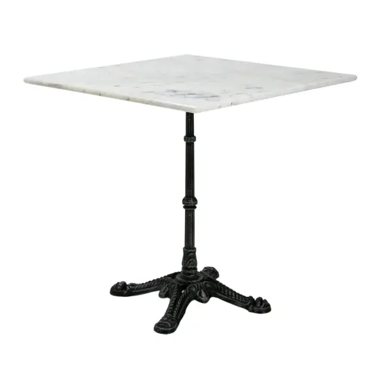 Cafeégrupp med stol i gjuten aluminium och bord med stenskiva.