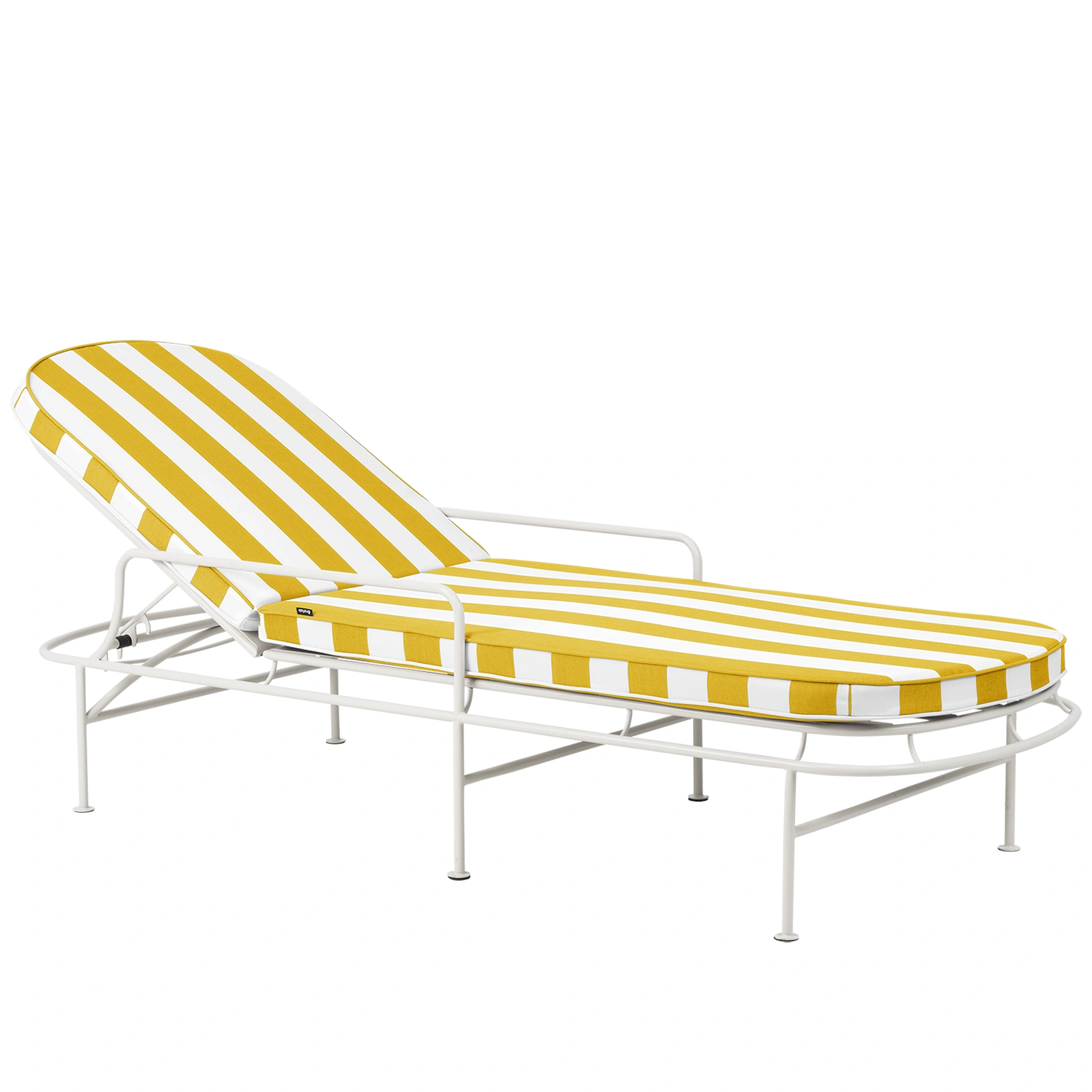 Luta dig tillbaka och låt tankarna vandra till soliga stränder och livfulla sommardagar. Arts solsäng kombinerar avslappnad elegans med genomtänkt komfort – perfekt för att njuta av solen. Den mjukt böjda stålramen ger en luftig känsla, medan det randiga tyget i Soft White med gula ränder tillför en lekfull och energisk touch som lyser upp din uteplats. Den justerbara ryggdelen gör det enkelt att hitta rätt lutning, oavsett om du vill läsa, vila eller bara njuta av utsikten.