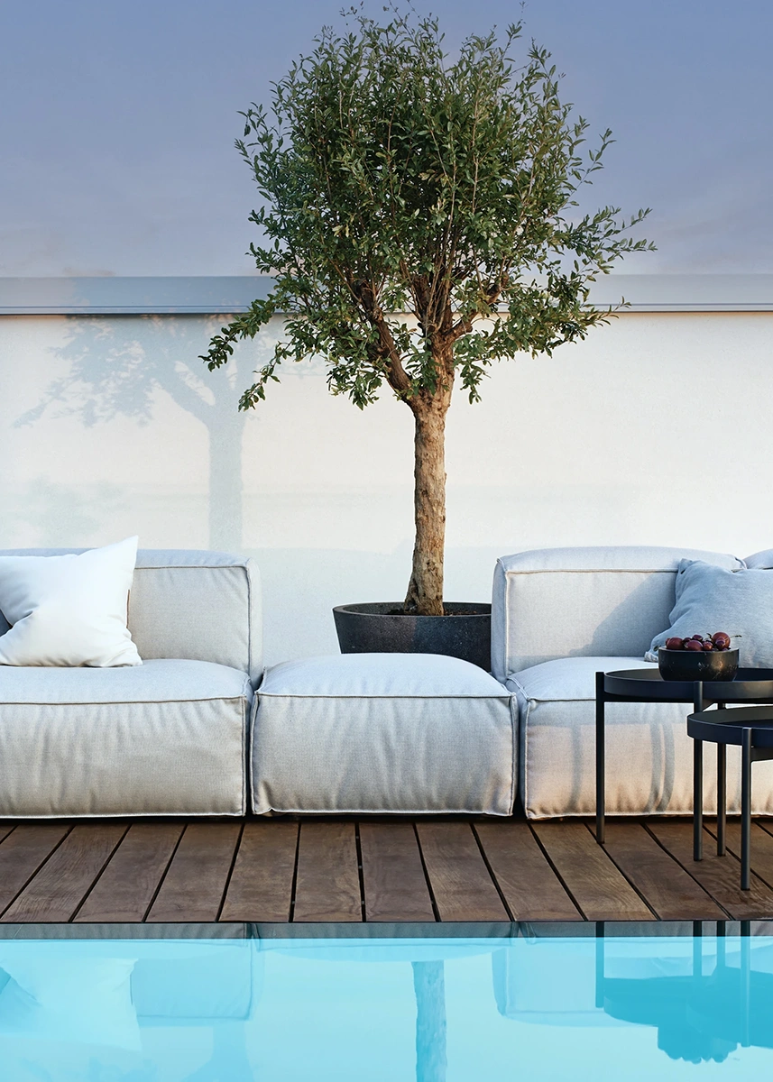 Asker Ottoman är klädd i Sunbrella-tyg – ett slitstarkt, färgbeständigt och vädertåligt material som är särskilt utvecklat för utomhusbruk. Tyget har en textil känsla som påminner om inomhustextilier, men med egenskaper som gör det motståndskraftigt mot fukt, blekning och smuts. Under tyget finns Quick Dry-skum, ett snabbtorkande och ventilerande fyllnadsmaterial som tillåter vatten att passera igenom och torka upp utan att stanna kvar i möbeln. Kombinationen av dessa material gör ottomanen både bekväm och praktisk – perfekt för ett liv utomhus.
