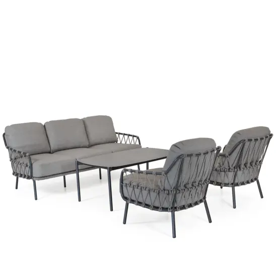 Avani diningfåtölj i antracitgrå aluminium med textilrep och dynor i färgen greige. Dynor i kraftig akryltextil, med avtagbara klädslar.