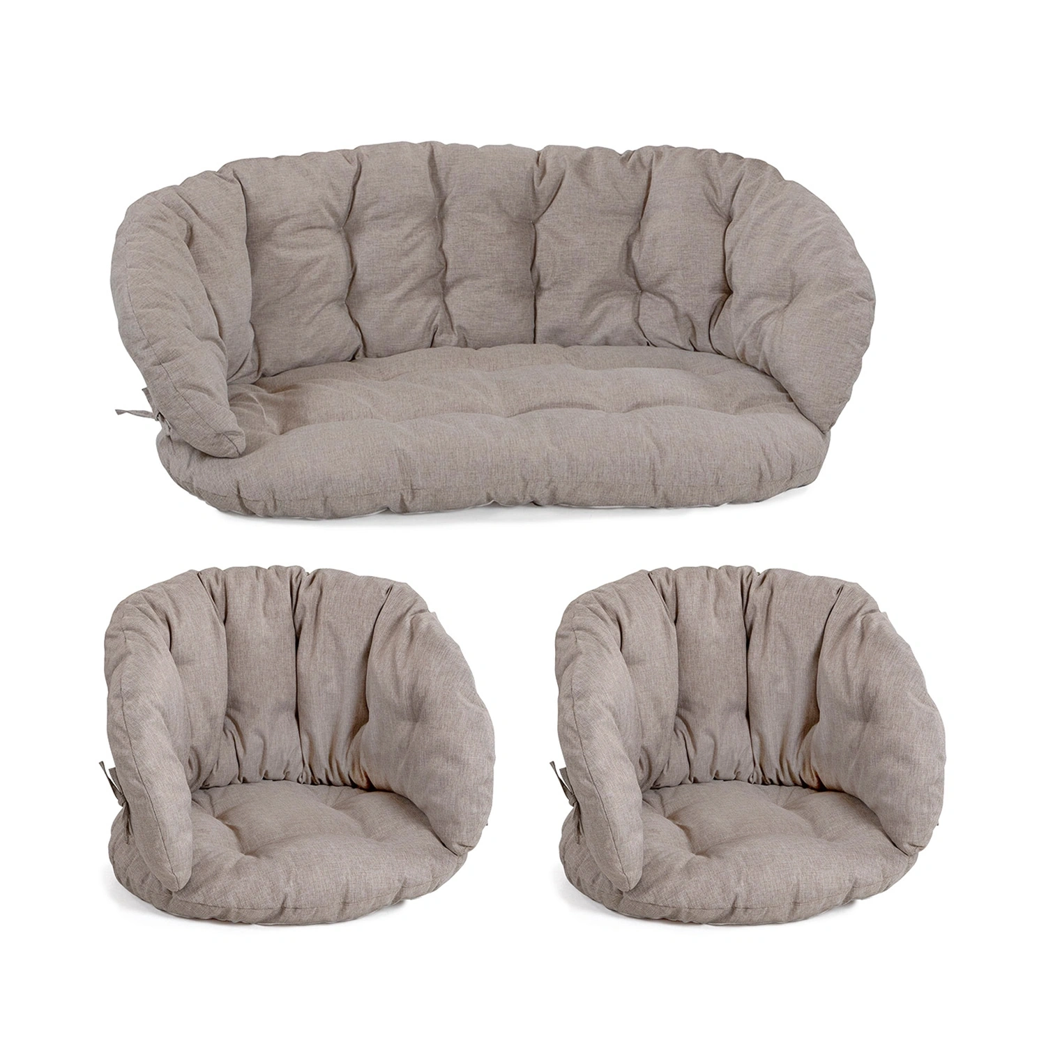 Ett dynset i en neutral beige färg, framtaget för Bahamas 2-sitsgrupp i rotting. Färgen är jämn och diskret med en lätt textur som ger ett mjukt intryck. Den grå tonen är diskret och harmonisk, särskilt framtagen för att matcha Bahamasgruppen i rotting.