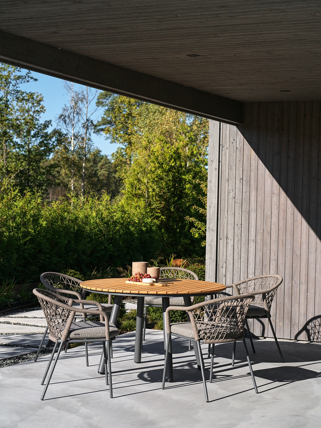 Design och hantverk i perfekt harmoni med det runda bordet Bam Bo, ett fint exempel på modern elegans. Generös, rund form som framhävs av vackra bamburibbor, allt vilandes på en stomme i aluminium med fyra ben.