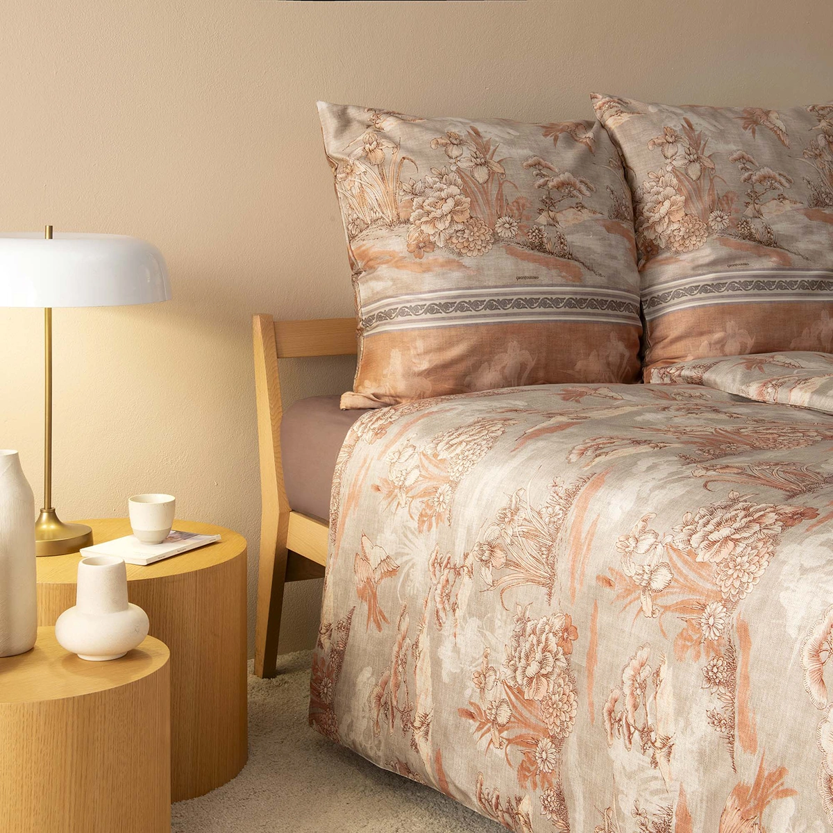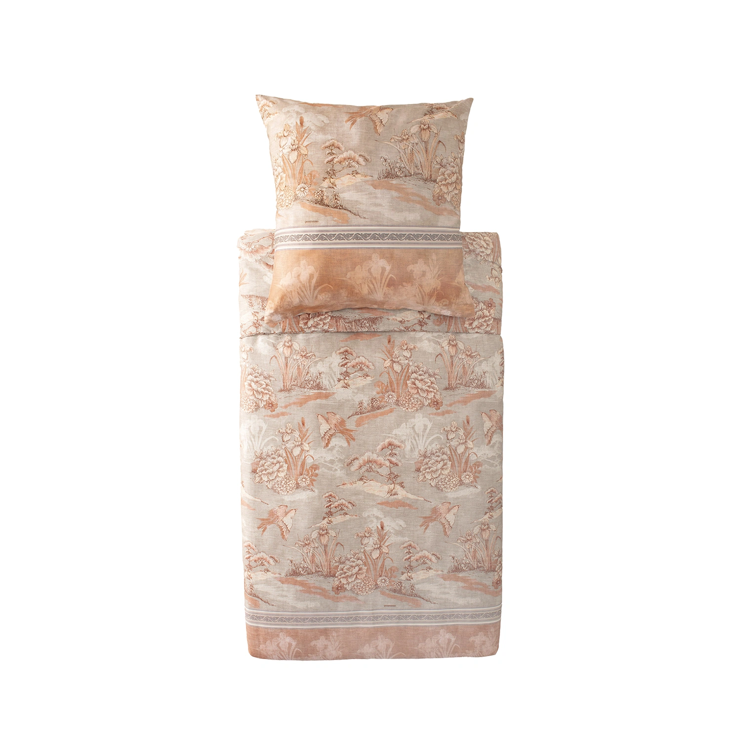 Bassetti Aquaforte 41 bäddset för dubbeltäcke. Acquaforte för in den italienska renässansen i hemmet med en tecknad design i terrakotta, beige och mjuka rosatoner – ett mönster som för tanken till Rom och Piranesis grafiska arv. Ett bäddset innehåller ett påslakan (220×220 cm) och två kuddfodral (60×50 cm). Påslakan och örngott är försett med en dragkedja.