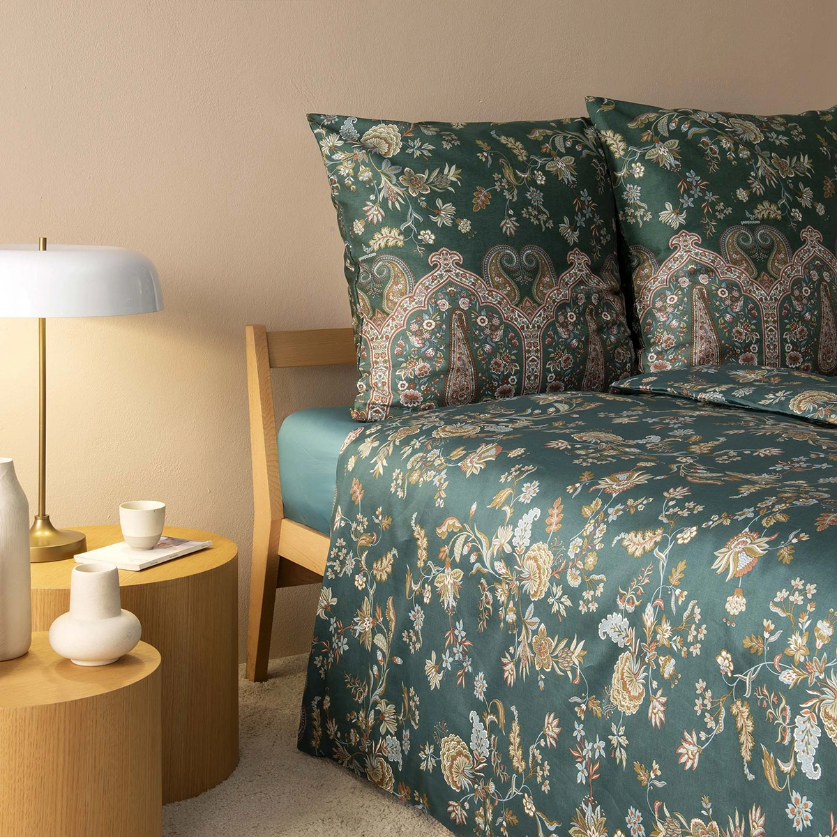 Indian Roses för tankarna till orientaliska trädgårdar och antika textilier från Persien och Indien. Mönstret är en modern tolkning av “Livets träd”, där florala element och paisleydetaljer vävs samman i en rik komposition. Färgskalorna varierar från djupa blå toner till varma gröna och jadefärgade nyanser, vilket skapar en känsla av lyx och exotisk elegans. Indian Roses är ett mönster som berättar en historia om kulturmöten och tidlös skönhet – perfekt för dig som vill ge sovrummet en poetisk och sofistikerad karaktär.