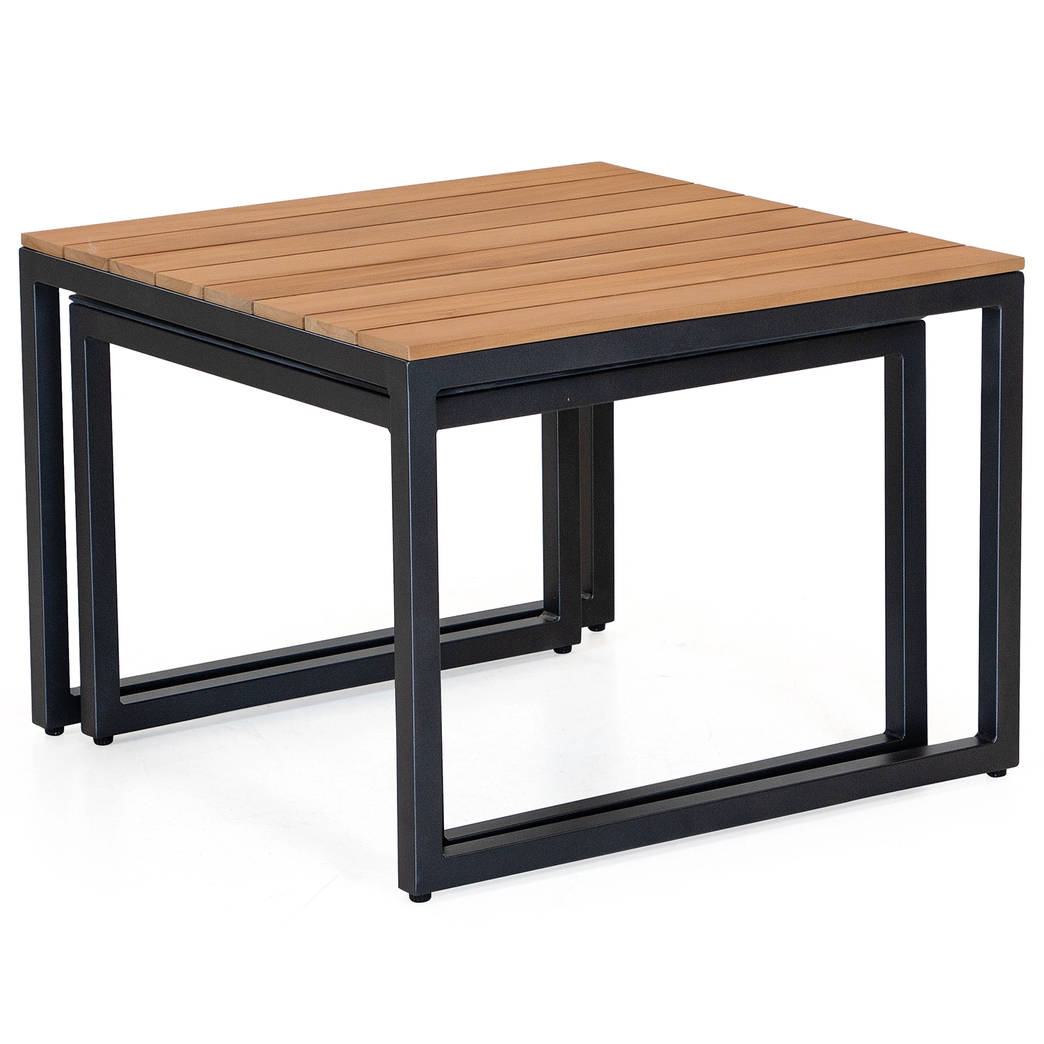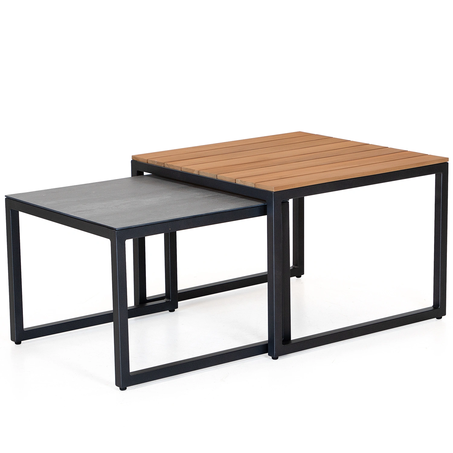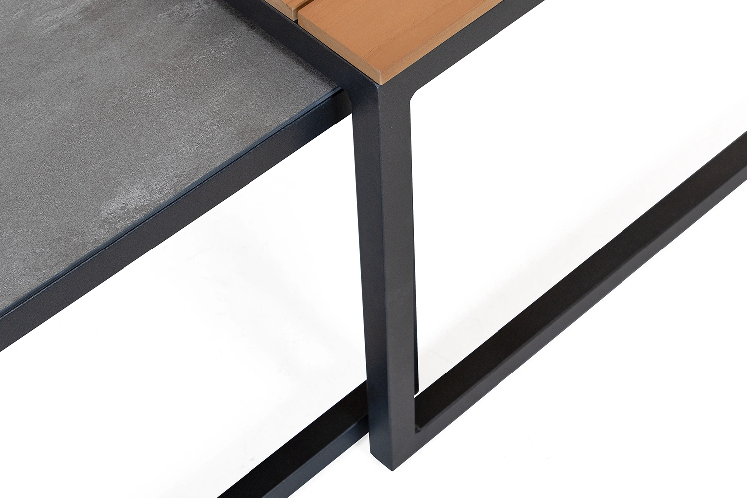 Baza är ett elegant och mångsidigt satsbord från Atleve, utformat för att passa både moderna och klassiska utemiljöer. Setet består av två kvadratiska bord med distinkt karaktär: ett med bordsskiva i teak som tillför värme och naturlig struktur, och ett med 3D-printad glasskiva i sandfärgad ton med subtilt stenmotiv. Den pulverlackerade aluminiumstommen i antracit ger ett grafiskt och sobert uttryck som kontrasterar fint mot teakens levande yta.