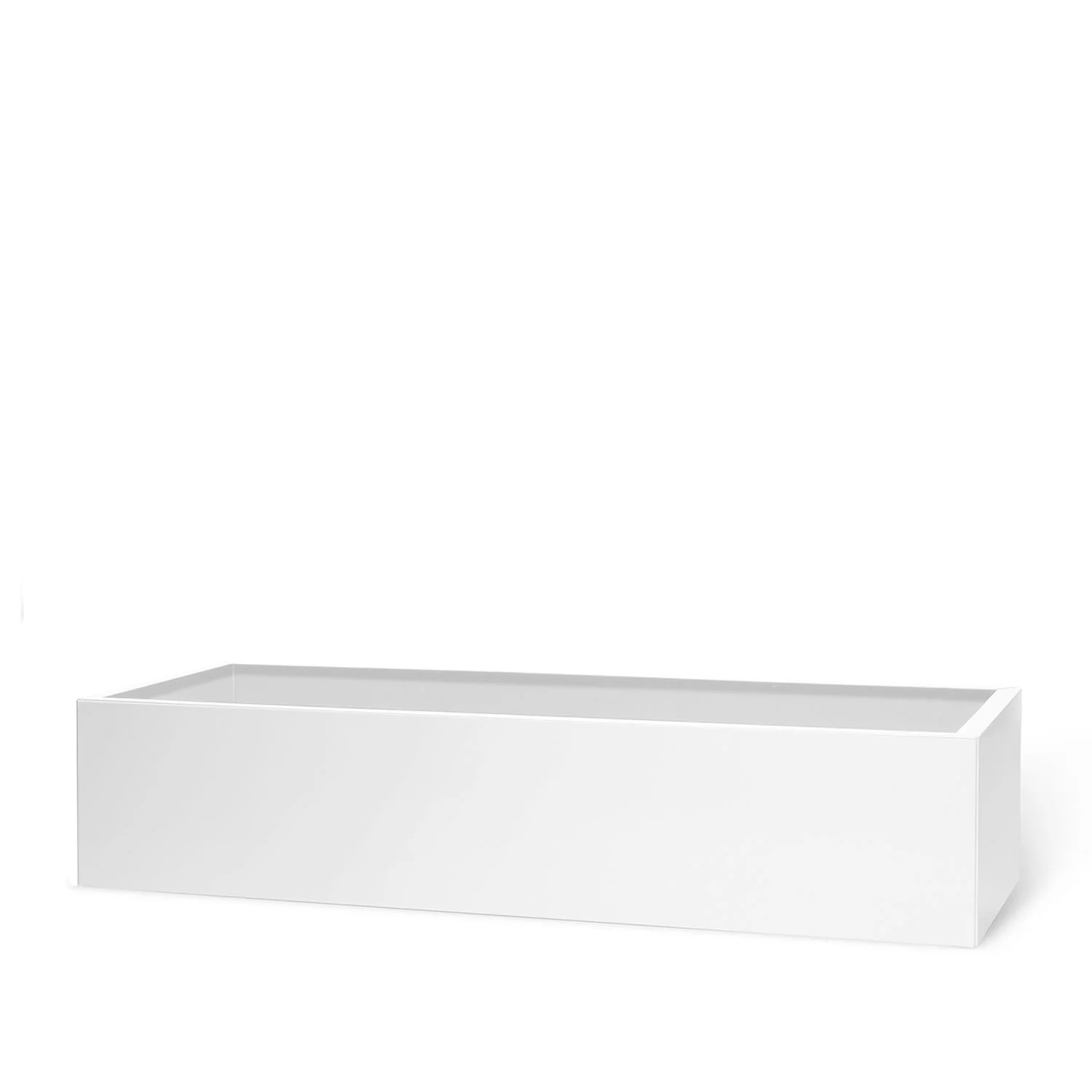 Modellen är tillverkad i rostfritt, frostsäkert stål med UV-beständig vit lackering, vilket gör att den kan stå ute året runt. Lådan saknar botten, ben och hjul, vilket gör den särskilt lämplig att placera direkt på gräsmatta, grus, betong eller asfalt. Det gör den idealisk för att definiera zoner i utemiljön, till exempel längs ytterkanten av en terrass eller som avgränsning i en trädgård.