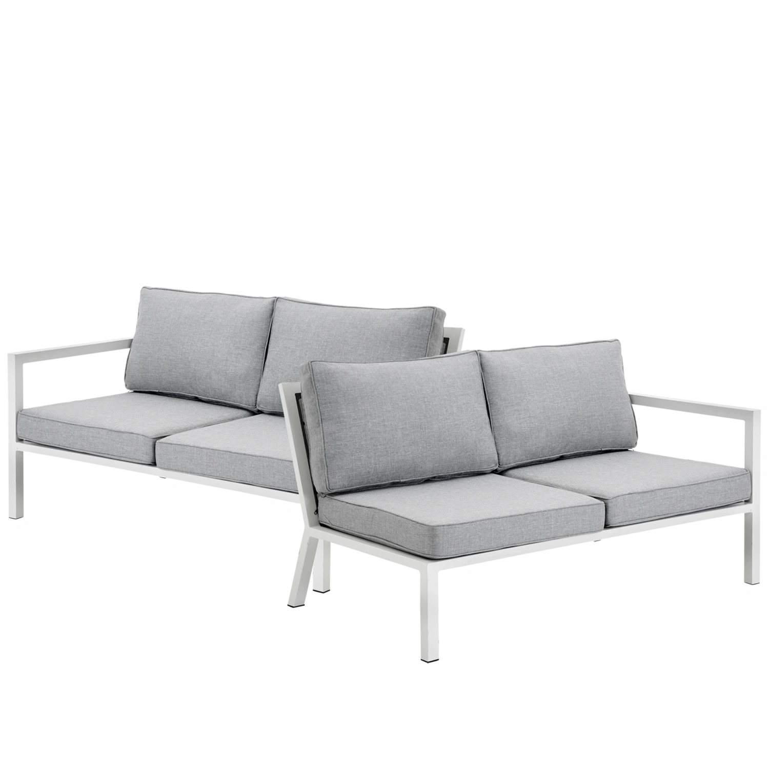 Belfort – en modern loungeserie med mattvit eller svart aluminiumram och gråa dynor. Belfort är extra komfortabel att sitta i, tack vare de tjocka ryggdynorna. I serien finns 4 byggbara soffdelar, fåtölj, och ett bord med skiva av härdat glas. De gråa klädslarna är avtagbara och tvättbara.