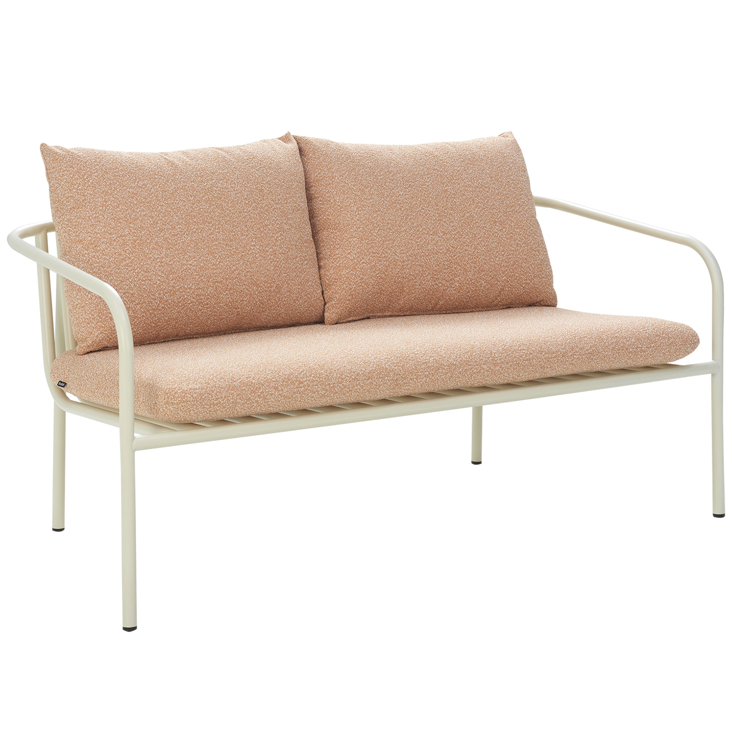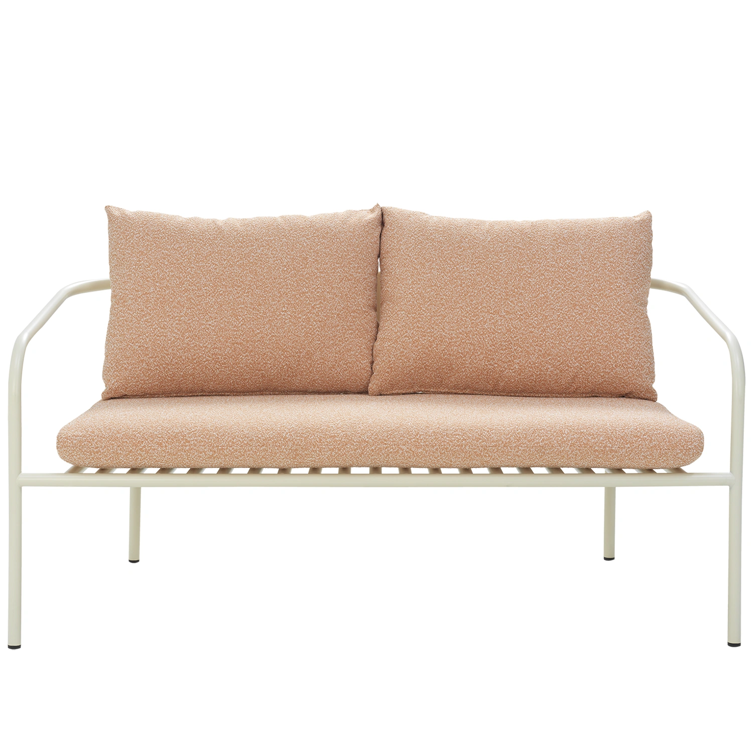 Bendt soffa i pärlvitt med dynor i Teddy orange är en modern loungemöbel som kombinerar skandinavisk enkelhet med varm personlighet. Den pärlvita stommen ger ett ljust och luftigt intryck, medan dynorna i det boucléliknande tyget Teddy orange tillför en mjuk, spräcklig struktur i nyanser av orange och persika – som en solnedgång i textilform.