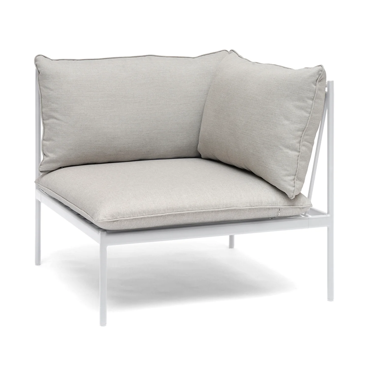 Hörndel i serien Bolmsö från Hillerstorp. I pulverlackerad vit aluminium med dynor i gråbeige olefin.