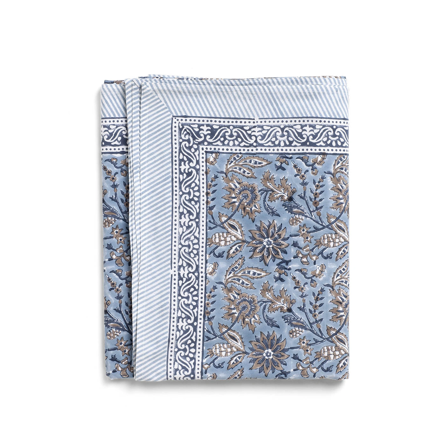 Bordsduk i naturlig bomull av hög kvalité. Tryck i mönstret Indian Summer i blåa och bruna nyanser. Mönstret är handtryckt med traditionell indisk blocktrycksteknik.