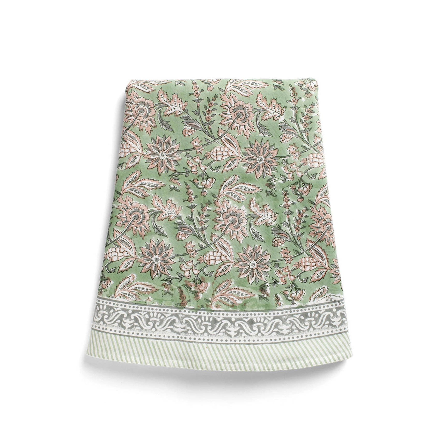 Vacker rund duk med blommönster i två färger och dekorativ border. Mönstret är handtryckt med traditionell indisk blocktryckteknik.