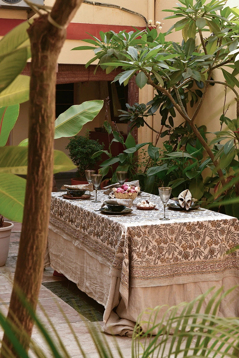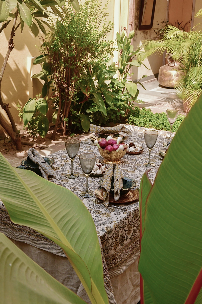 Det vackra Parrot-mönstret är handtryckt med traditionell träblocksteknik, vilket gör varje duk unik och ger en känsla av genuint hantverk. Designen är inspirerad av orientaliska textiltraditioner och är en del av kollektionen Seven Sisters of Himalaya, skapad efter år av studier av Indiens rika mönsterhistoria. Den dova blå färgen med detaljer i ockra och det detaljerade trycket ger bordet en sofistikerad och konstnärlig karaktär.
