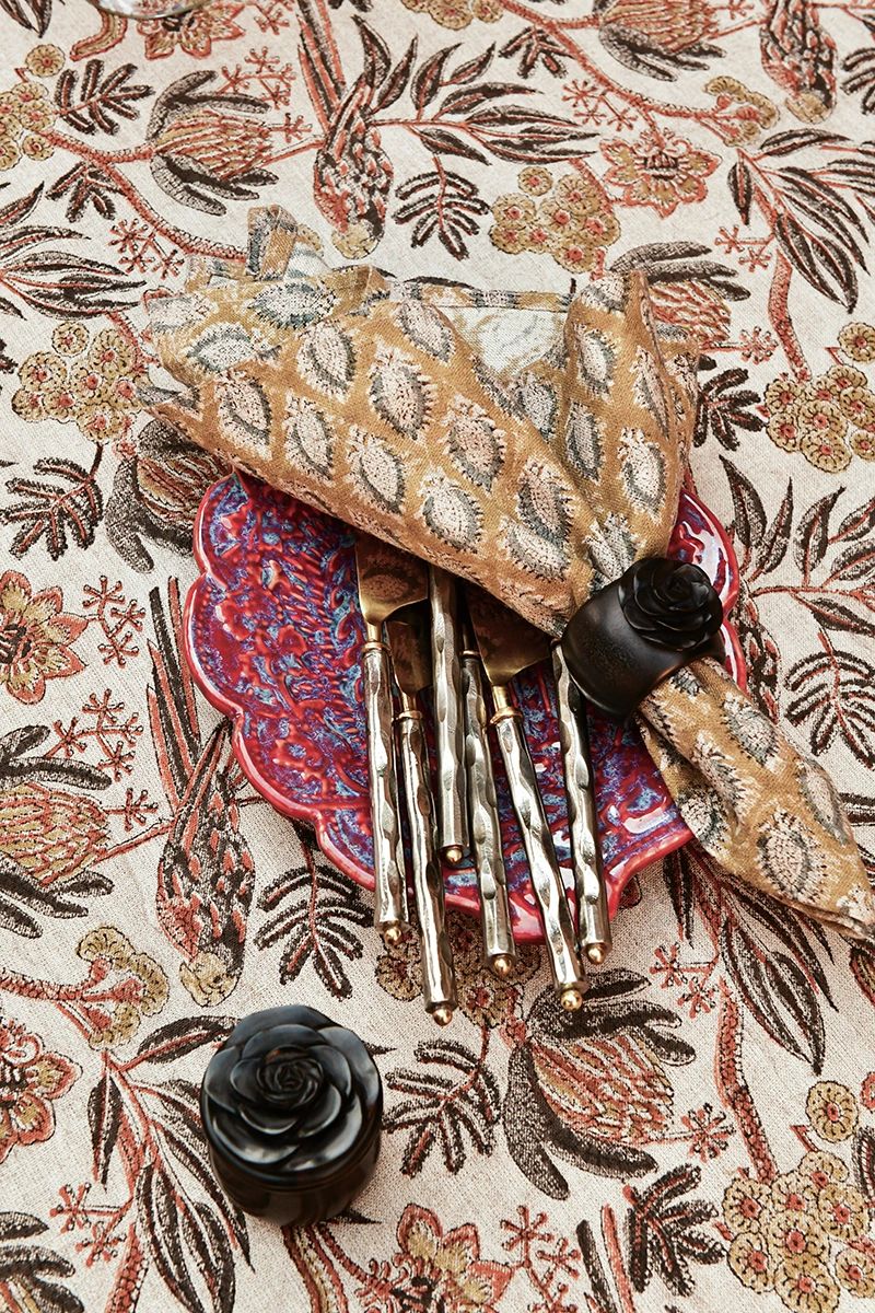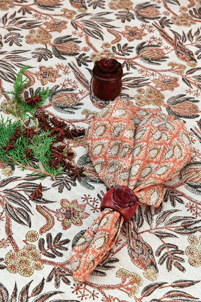 Det vackra Parrot-mönstret är handtryckt med traditionell träblocksteknik, vilket gör varje duk unik och ger en känsla av genuint hantverk. Designen är inspirerad av orientaliska textiltraditioner och är en del av kollektionen Seven Sisters of Himalaya. De rostfärgade tonerna – med inslag av brunt, ockra och dov orange – ger bordet en varm och sofistikerad karaktär, perfekt för att skapa en inbjudande atmosfär.