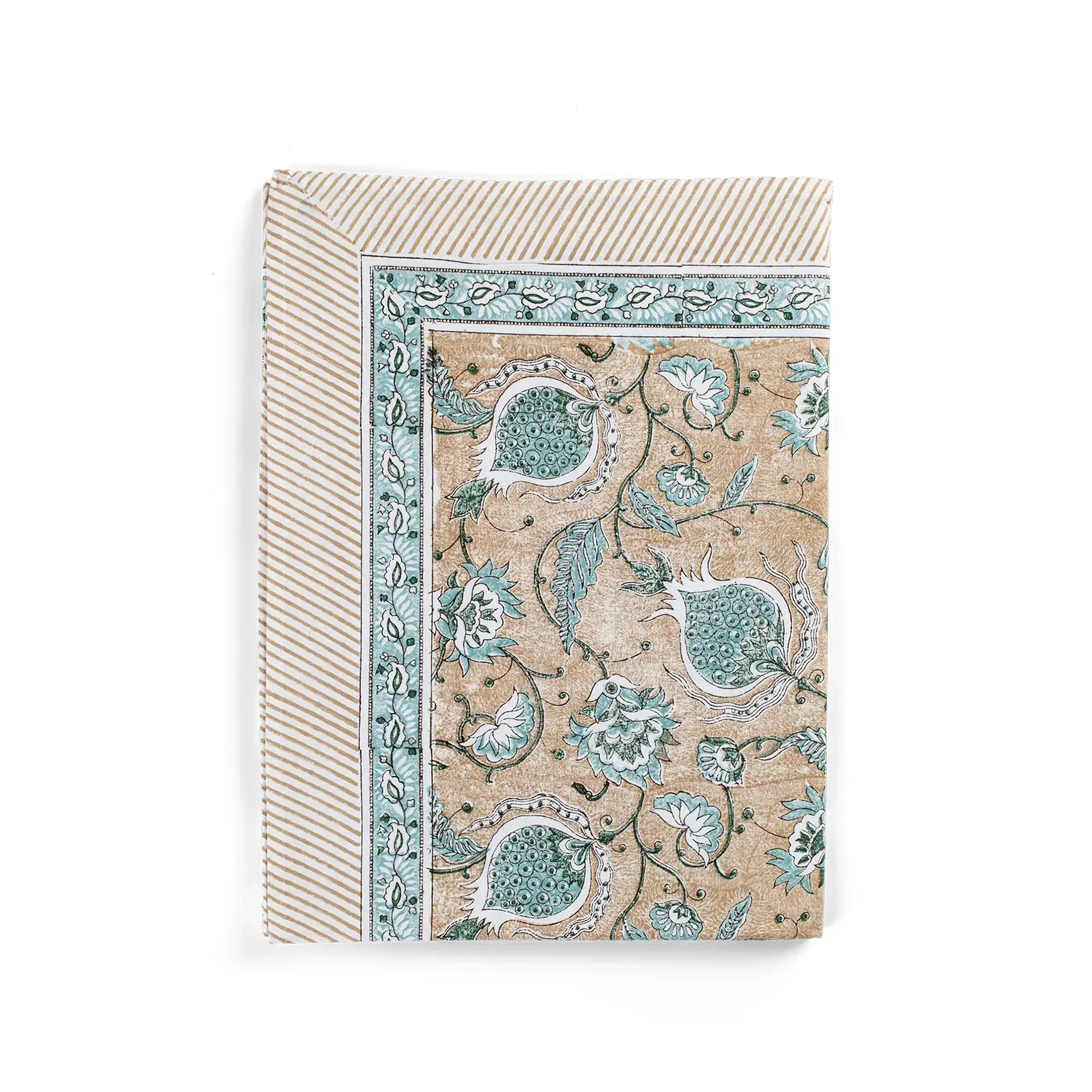 Elegant bordsduk med ett vackert blommönster och dekorativ border, tryckt på naturlig bomull av hög kvalité. Mönstret är handtryckt med traditionell indisk blocktryckteknik. Tryck i mönstret Pomegranate i beige och turkost.