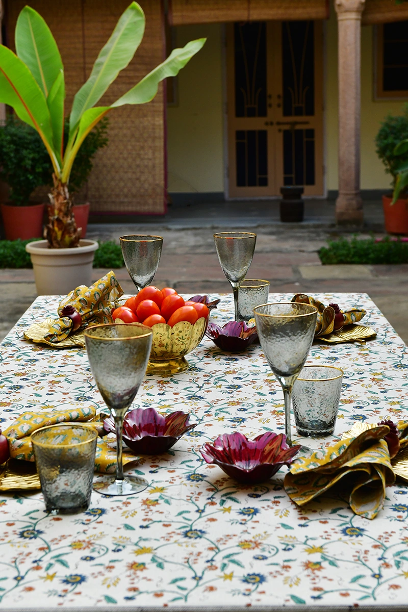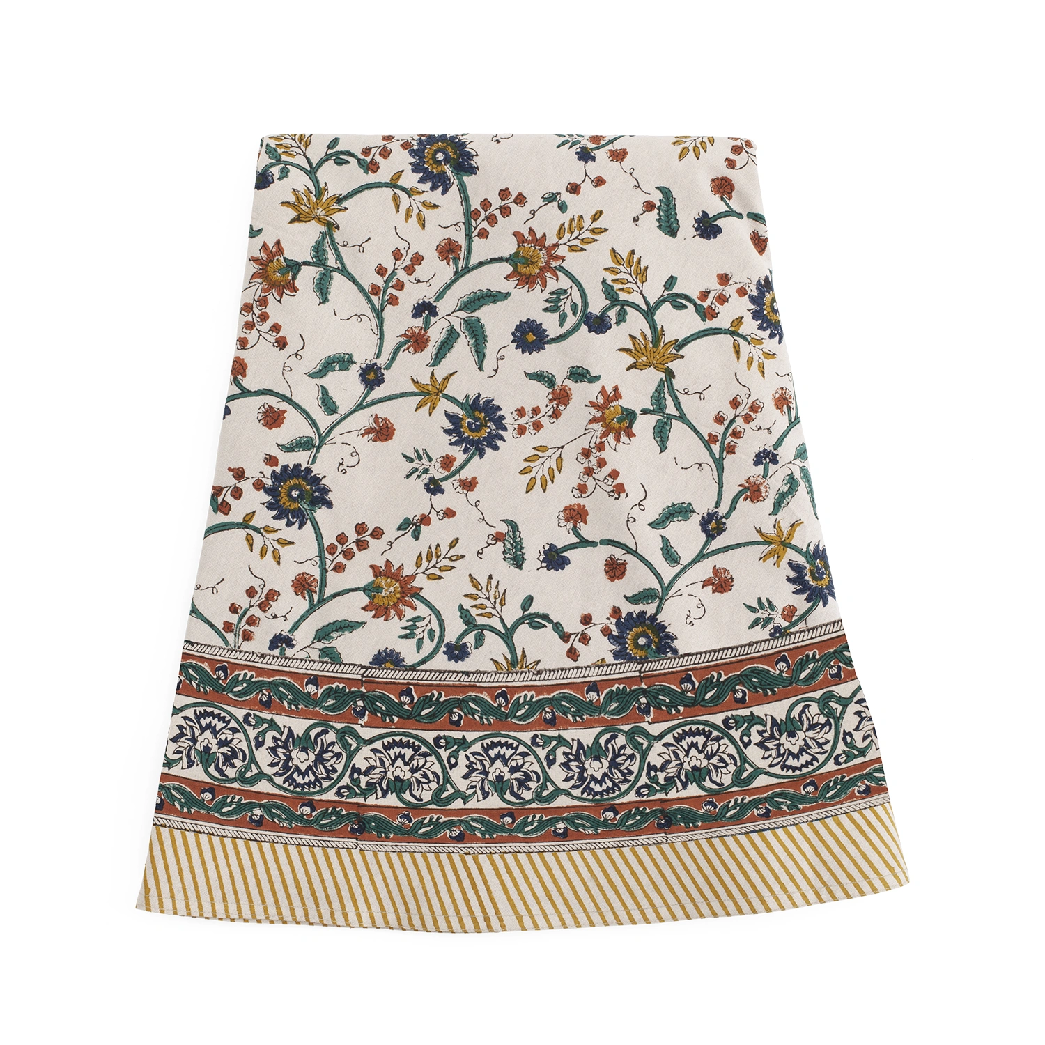 Det vackra Samode-mönstret är handtryckt med traditionell träblocksteknik, vilket gör varje duk unik och ger en känsla av äkta hantverk. Designen är inspirerad av de majestätiska väggmålningarna i Samode Palace i Indien och är en del av Chamois höstkollektion 2025. De harmoniska tonerna av ockra, blått och grönt mot en offwhite bas skapar en sofistikerad och inbjudande dukning.