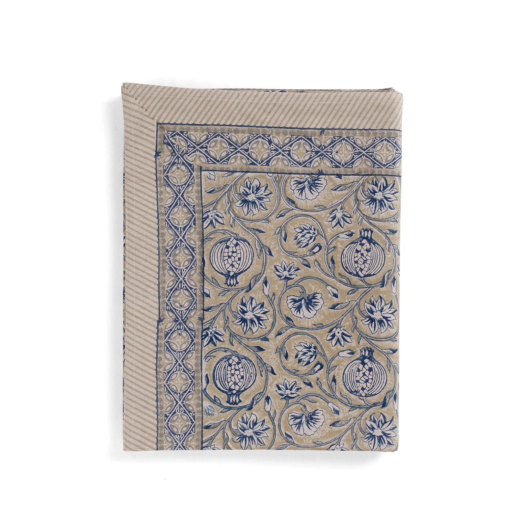 Förbättra din middagsupplevelse med Chamois bordsduk i mönstret Tangier Pomegranate i den raffinerade färgkombinationen beige och blått med grå detaljer. Prydd med ett häpnadsväckande flerfärgat tryck med virvlande stjälkar, granatäpplen, löv och blommor, samt en dekorativ bård, kommer denna bordsduk att ge en touch av raffinerad elegans till alla bord.