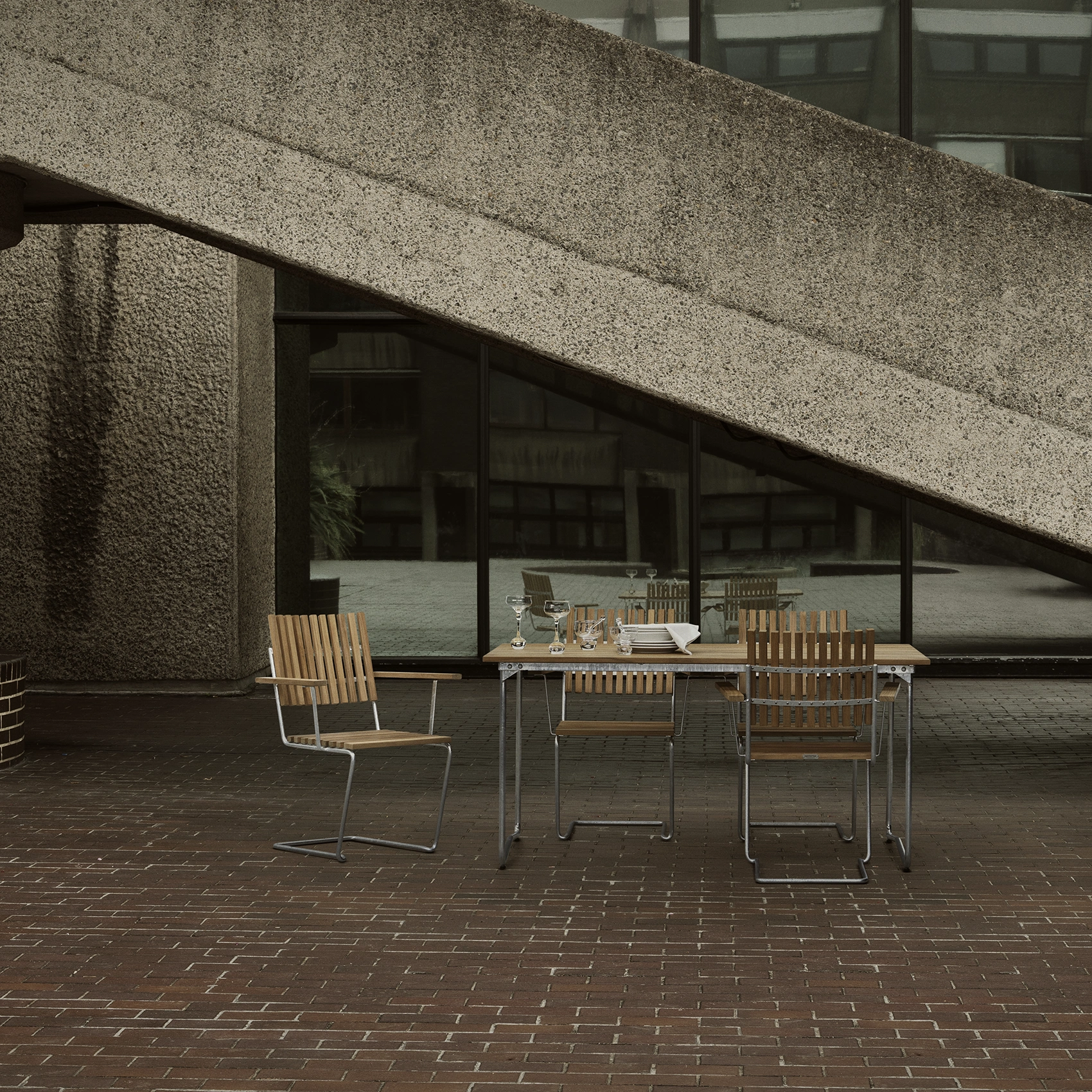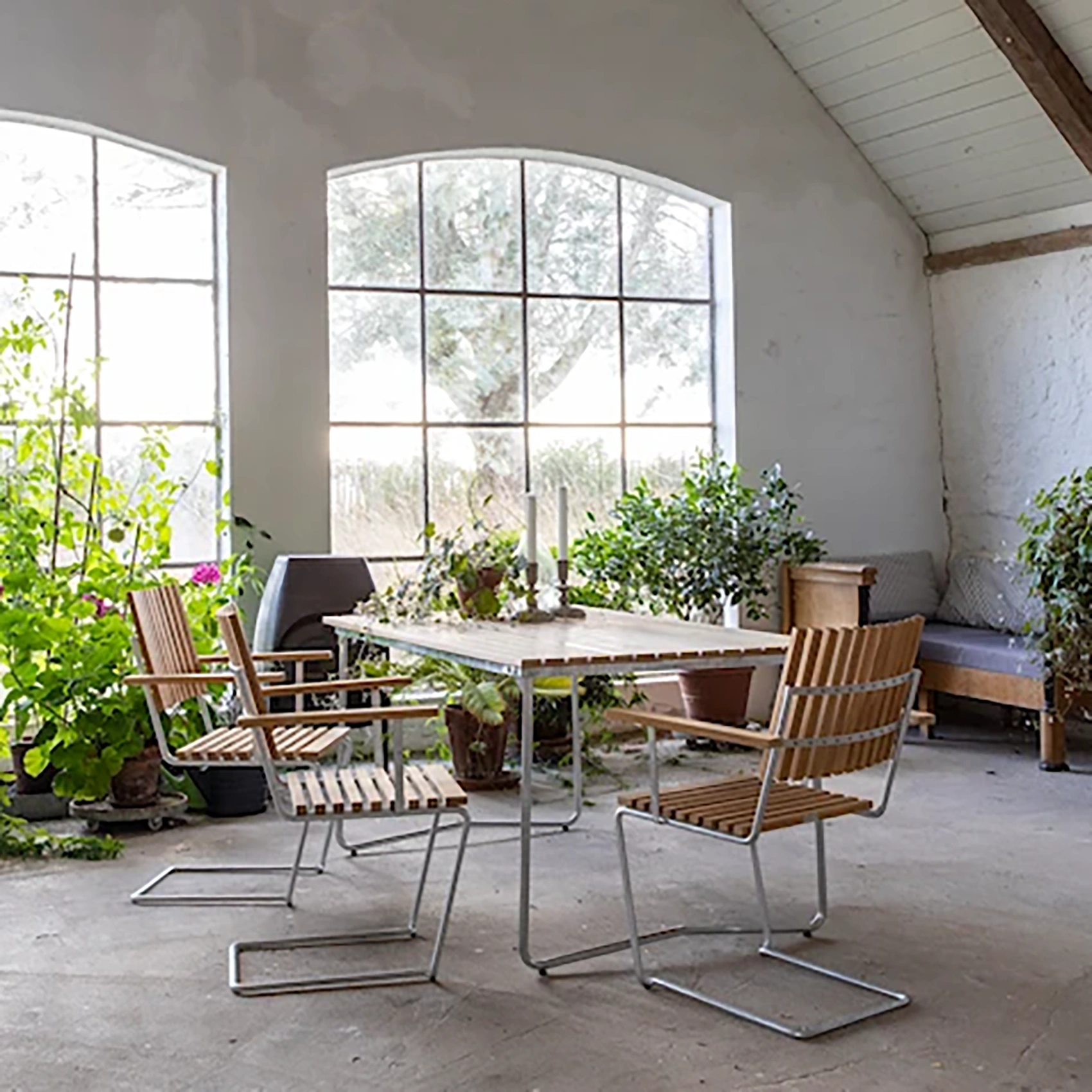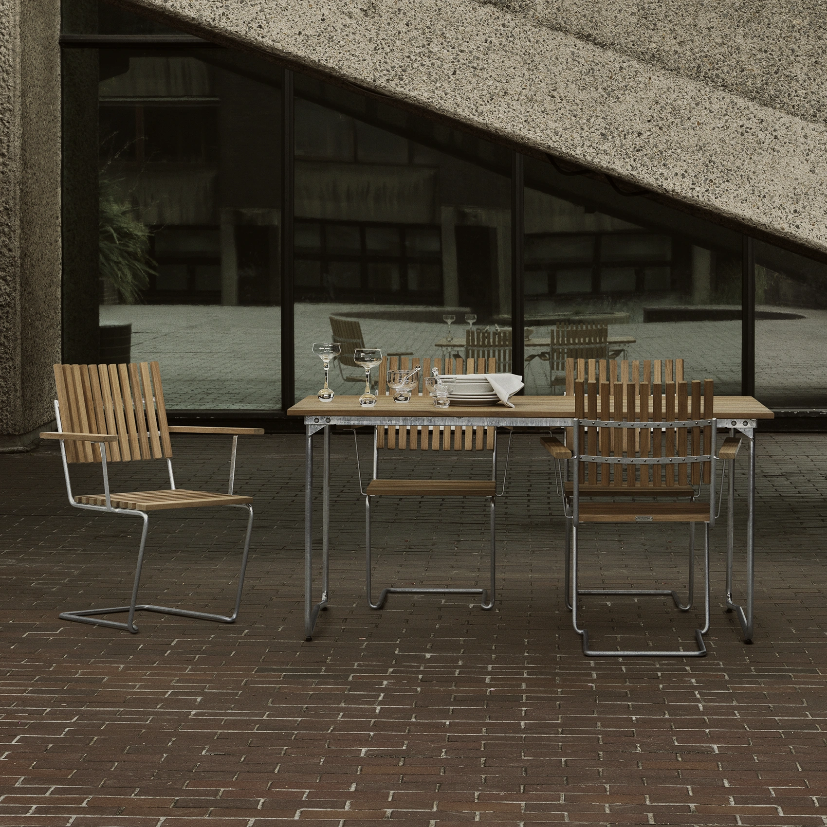 Stålstativet är varmförzinkat. Varmförzinkning ger en flammig yta som kan skifta i färg och glans. Variationerna jämnar dock ut sig med tiden. Det enda underhåll du behöver tänka på är vanlig rengöring. Mindre skador självläker där galvaniska strömmar gör att zink täcker över skadan. Stålet kommer från återvunnet skrot som smälts ned. Det smälta stålet justeras till rätt blandning innan det görs till stänger och möbler.