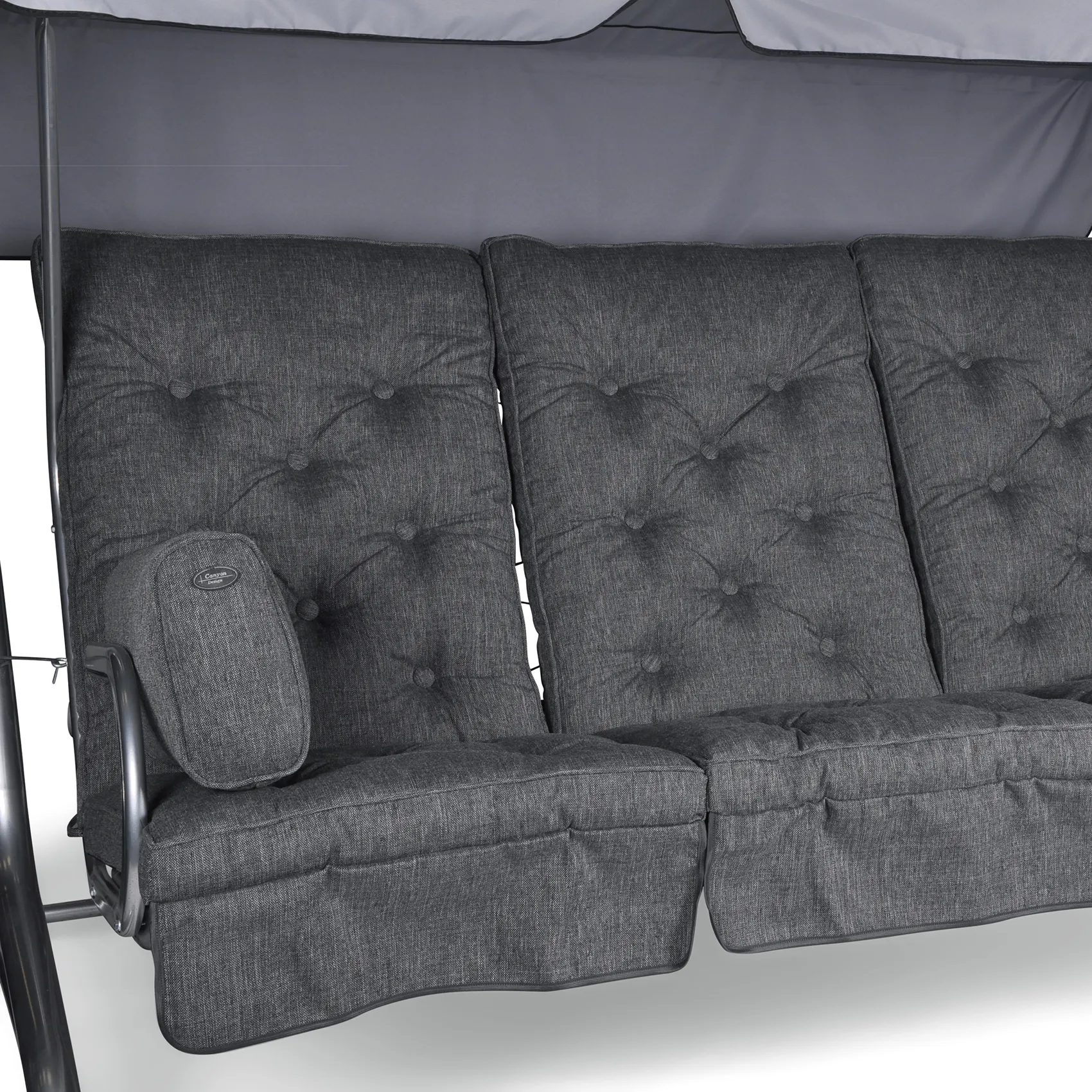 Canyon 2.0 hammockset med tre höga hammockdynor samt ett par sidokuddar. Dynorna är sydda i Olefintyg (pp) i färgen oxfordgrå.