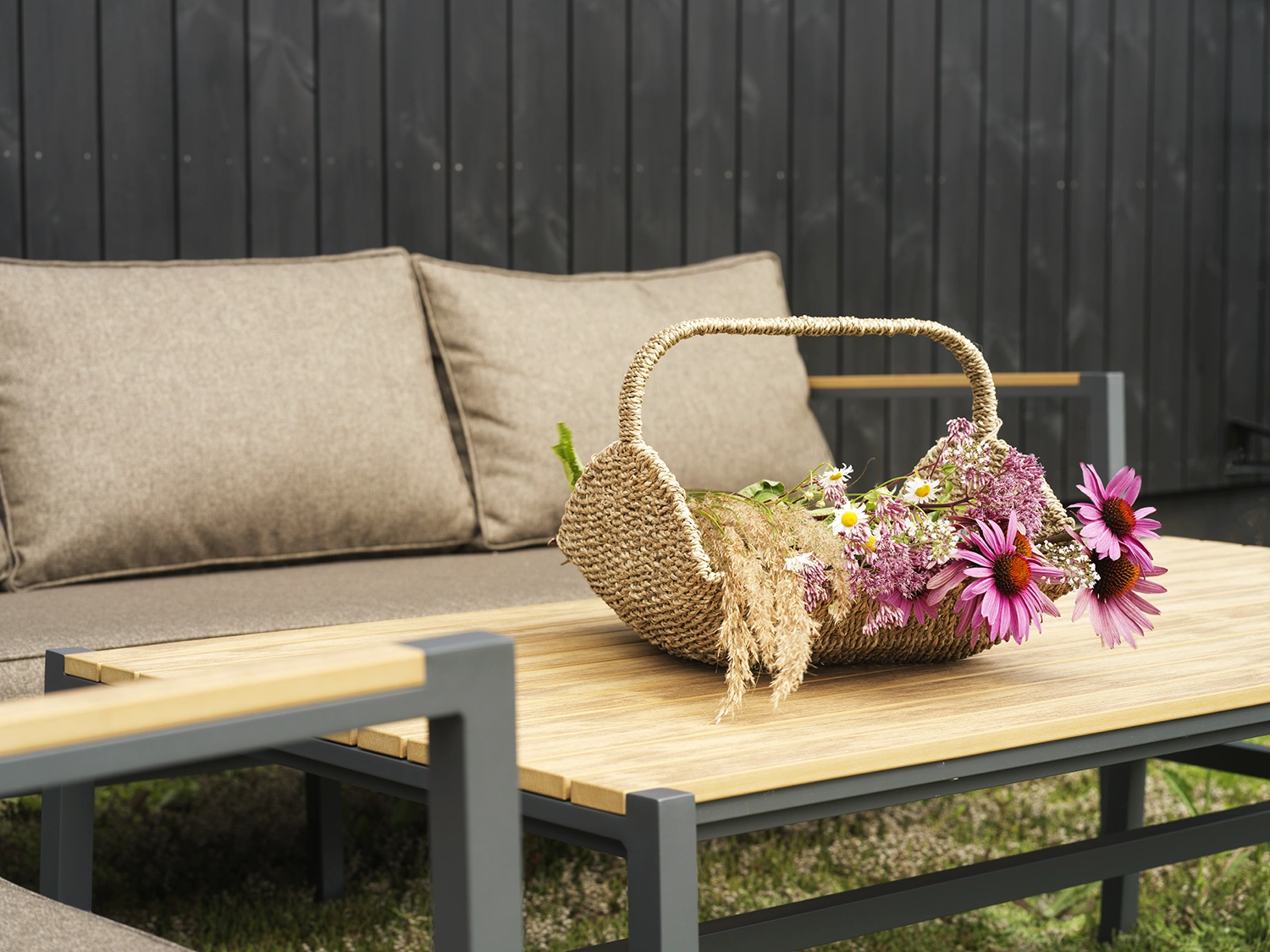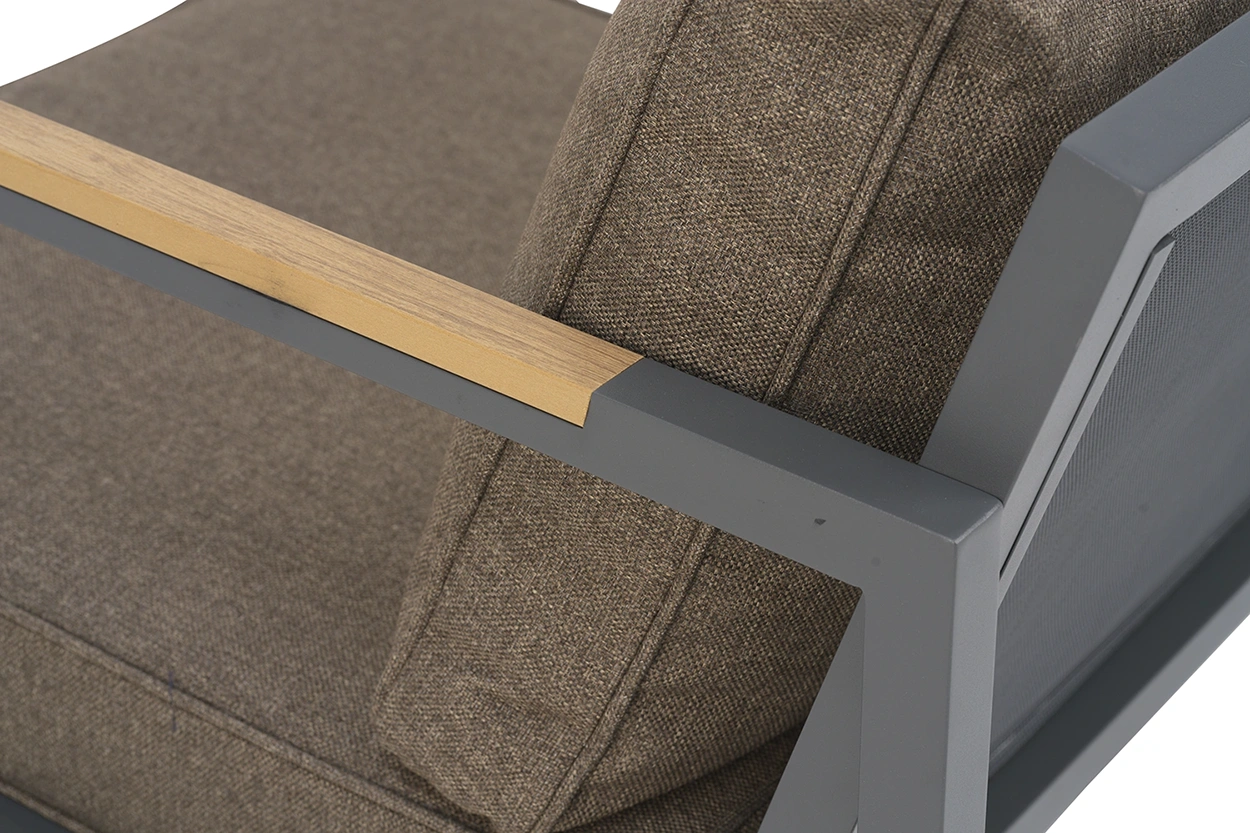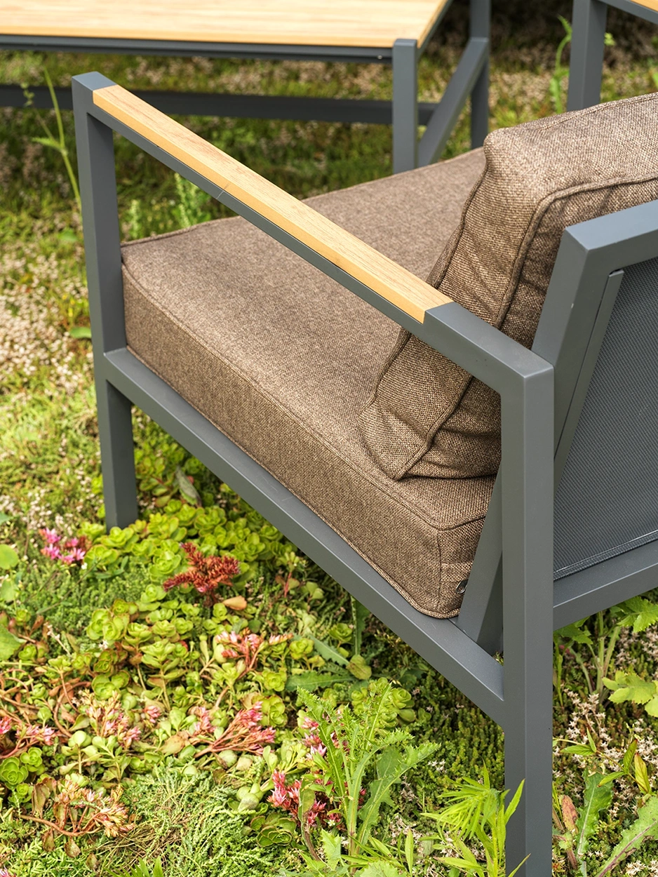 CAP är tillverkad i pulverlackerad aluminium – ett lätt, rostfritt och hållbart material som kräver minimalt underhåll. De integrerade detaljerna i syntetiskt trä (nonwood) har ett naturligt teakliknande utseende och är helt underhållsfria. Dynorna är klädda i olefintyg – ett slitstarkt utomhustyg som står emot solblekning och vardagligt slitage, men bör skyddas mot längre regnfall. För bästa hållbarhet rekommenderas att dynorna tas in vid fuktigt väder eller att möbeln skyddas med möbelskydd vid behov.