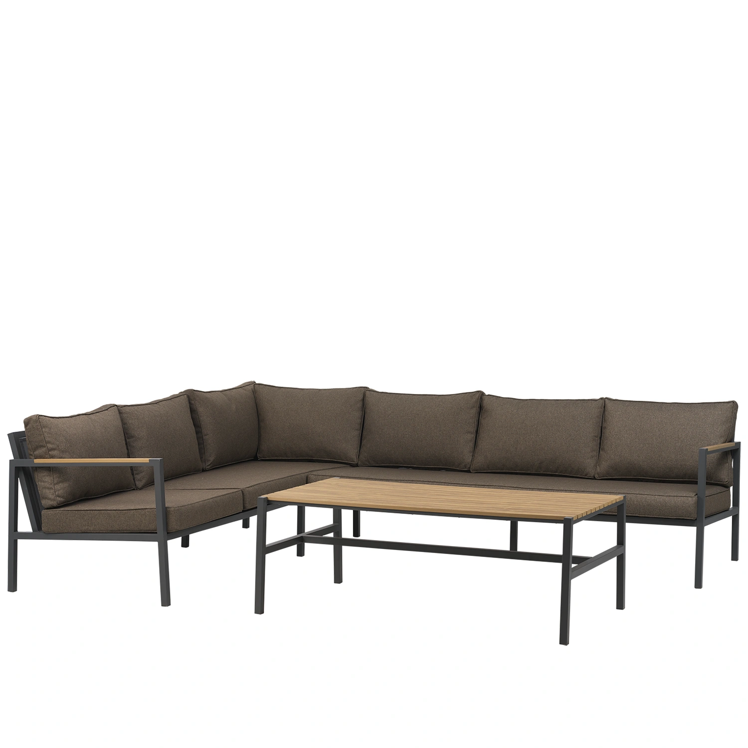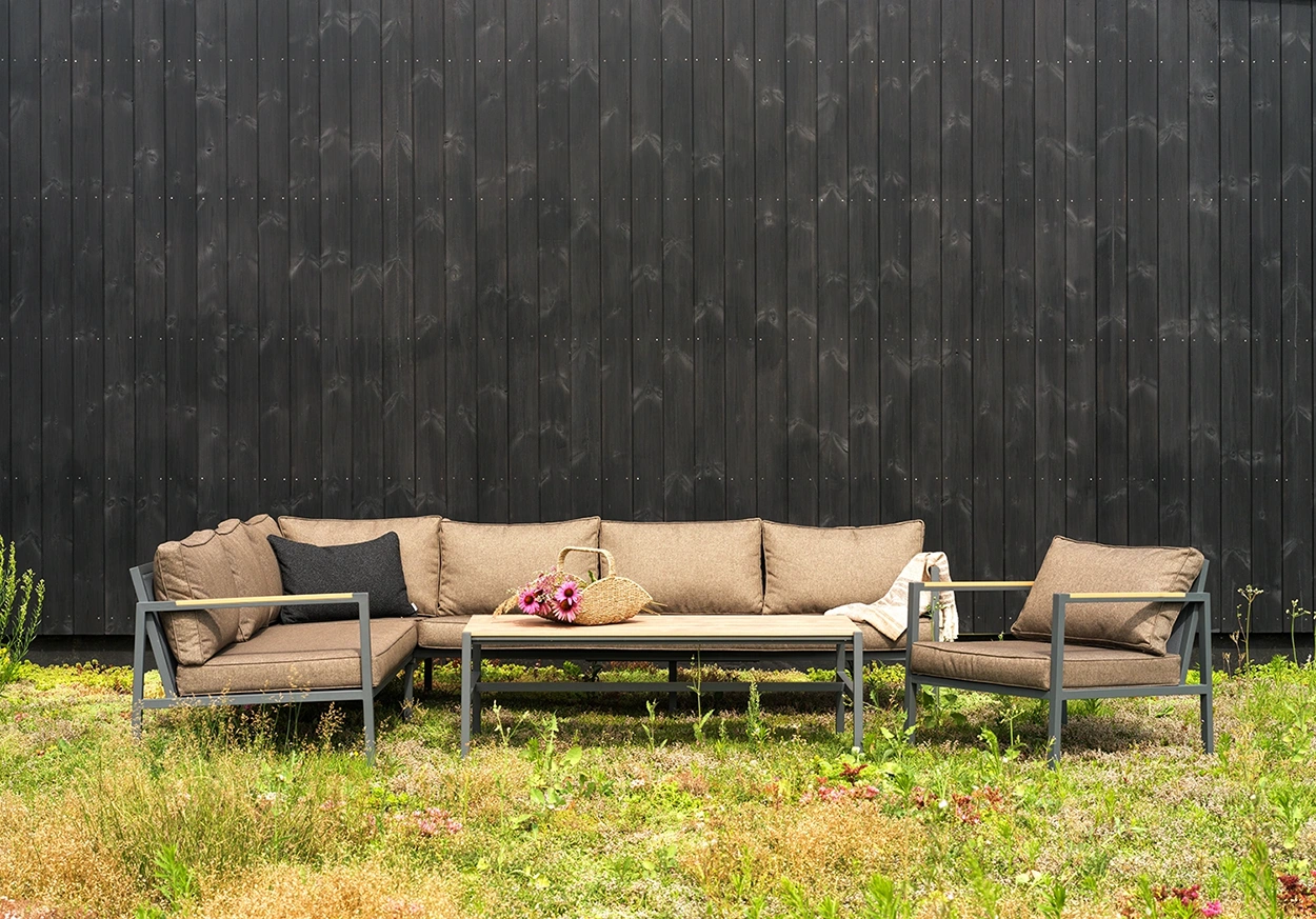CAP hörnsoffgrupp i antracitgrått med bruna dynor är en elegant och funktionell loungegrupp som förenar modern design med naturlig värme. Den mörka aluminiumstommen ger ett sobert och stilrent uttryck, medan de bruna dynorna tillför en jordnära känsla som smälter vackert in i grönskande trädgårdsmiljöer eller på en trätrall.