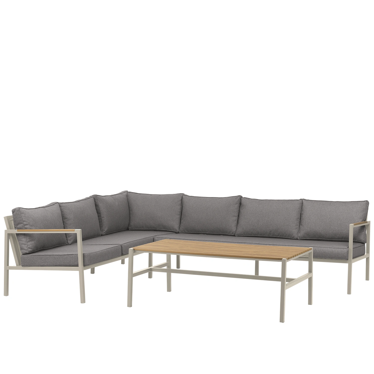 CAP hörnsoffgrupp i ljusgrått med matchande grå dynor är en stilren och komplett loungegrupp som kombinerar modern design med avslappnad komfort. Den pulverlackerade aluminiumstommen i ljusgrått ger ett luftigt och elegant intryck, medan de mjuka dynorna i grått skapar en harmonisk helhet som passar perfekt i både moderna och klassiska utemiljöer.