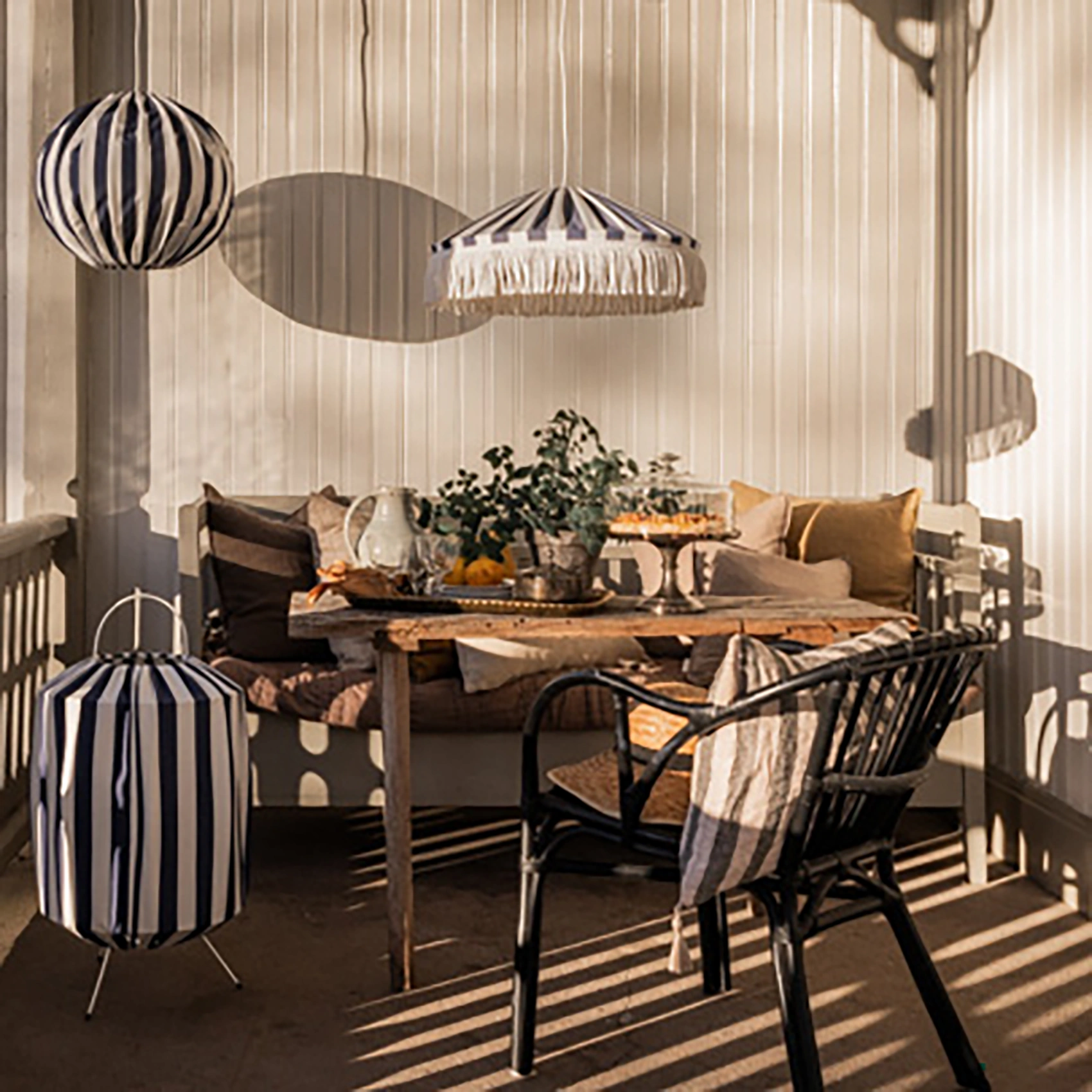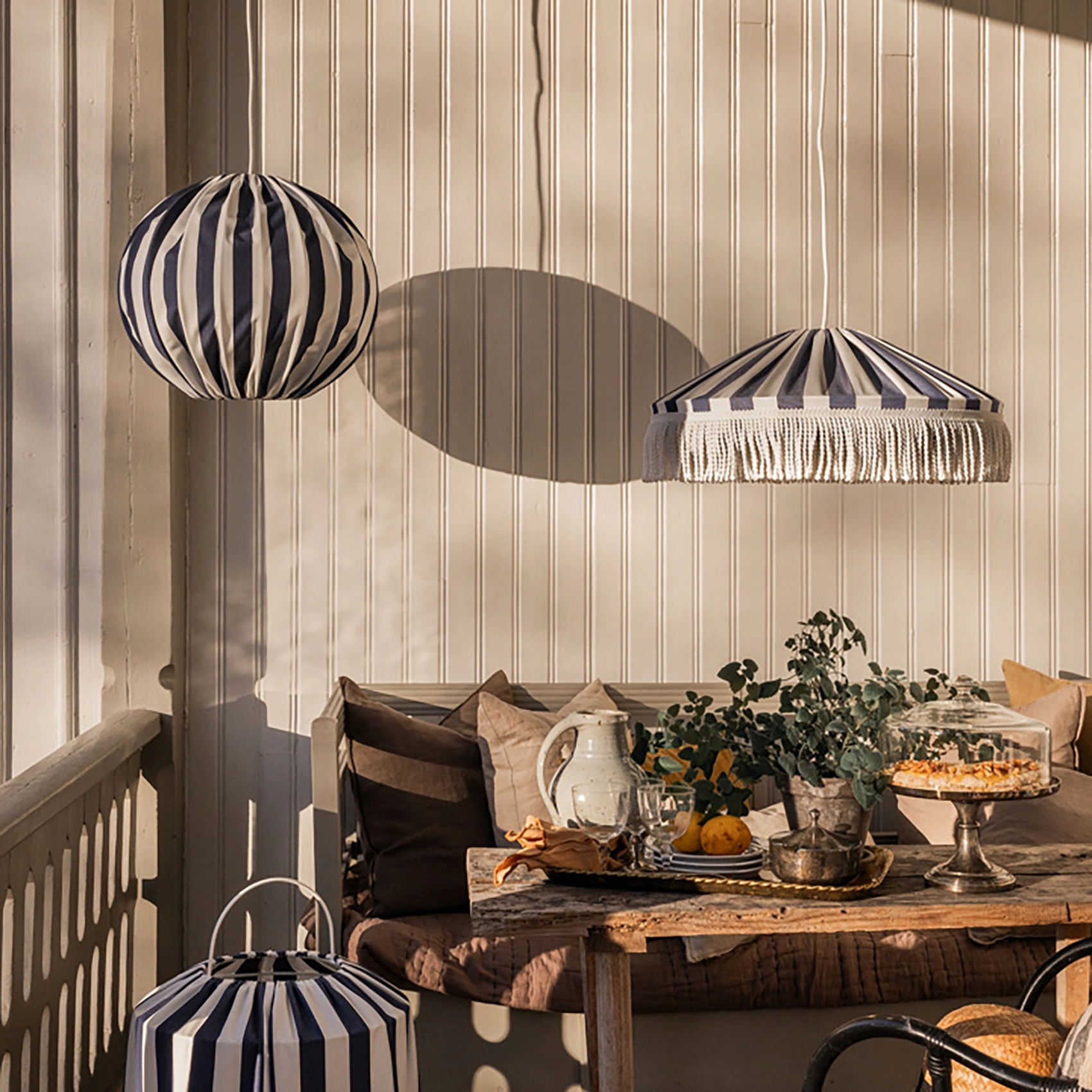 Taklampan Capri skapar en inbjudande atmosfär på uteplatsen. Lampan är tillverkad av väderbeständiga material där både tyg och frans är vattenavvisande, UV-beständiga och har en hög färgfasthet vilket betyder att de står emot blekning av starkt solljus. Capri är slitstark och har lång livslängd. Den 5 m långa gummikabeln med medföljande ögla på, gör placering och upphängning enkel och flexibel.