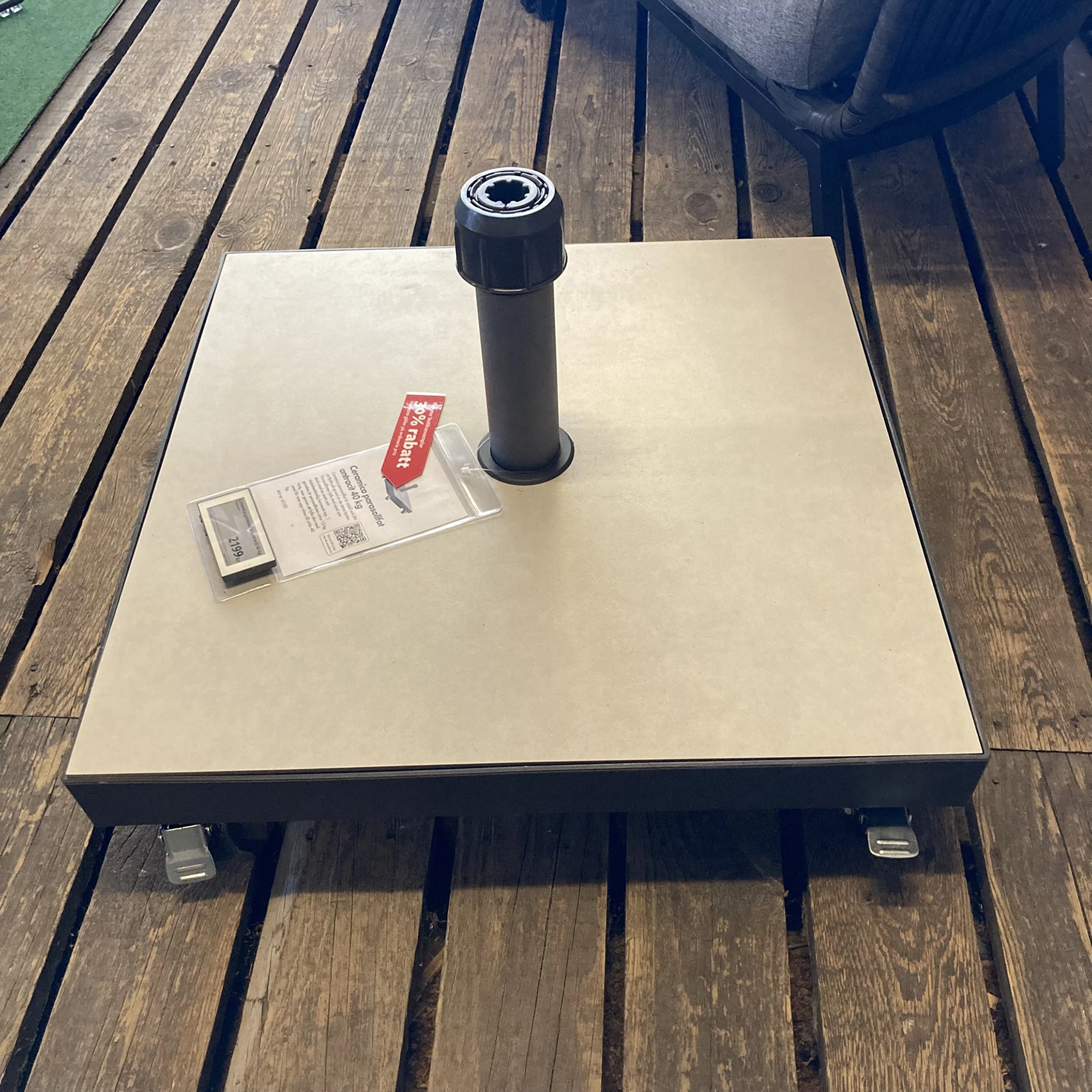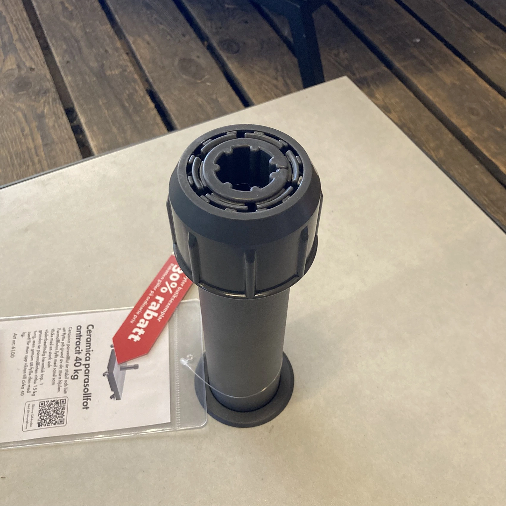 I grunden är parasollfoten cirka 15 kg tung, men genom att fylla den med sand får man upp vikten till cirka 40 kg.