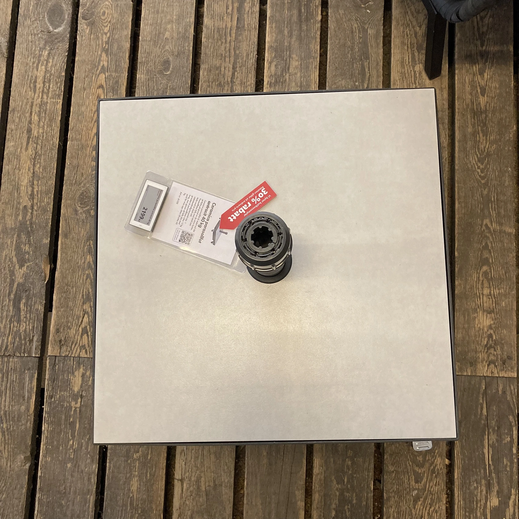 Ceramica parasollfot är stabil och lätt att flytta på grund av de stora hjulen. Parasollfoten fylls med sand som täcks med en stark och väderbeständig keramisk top.