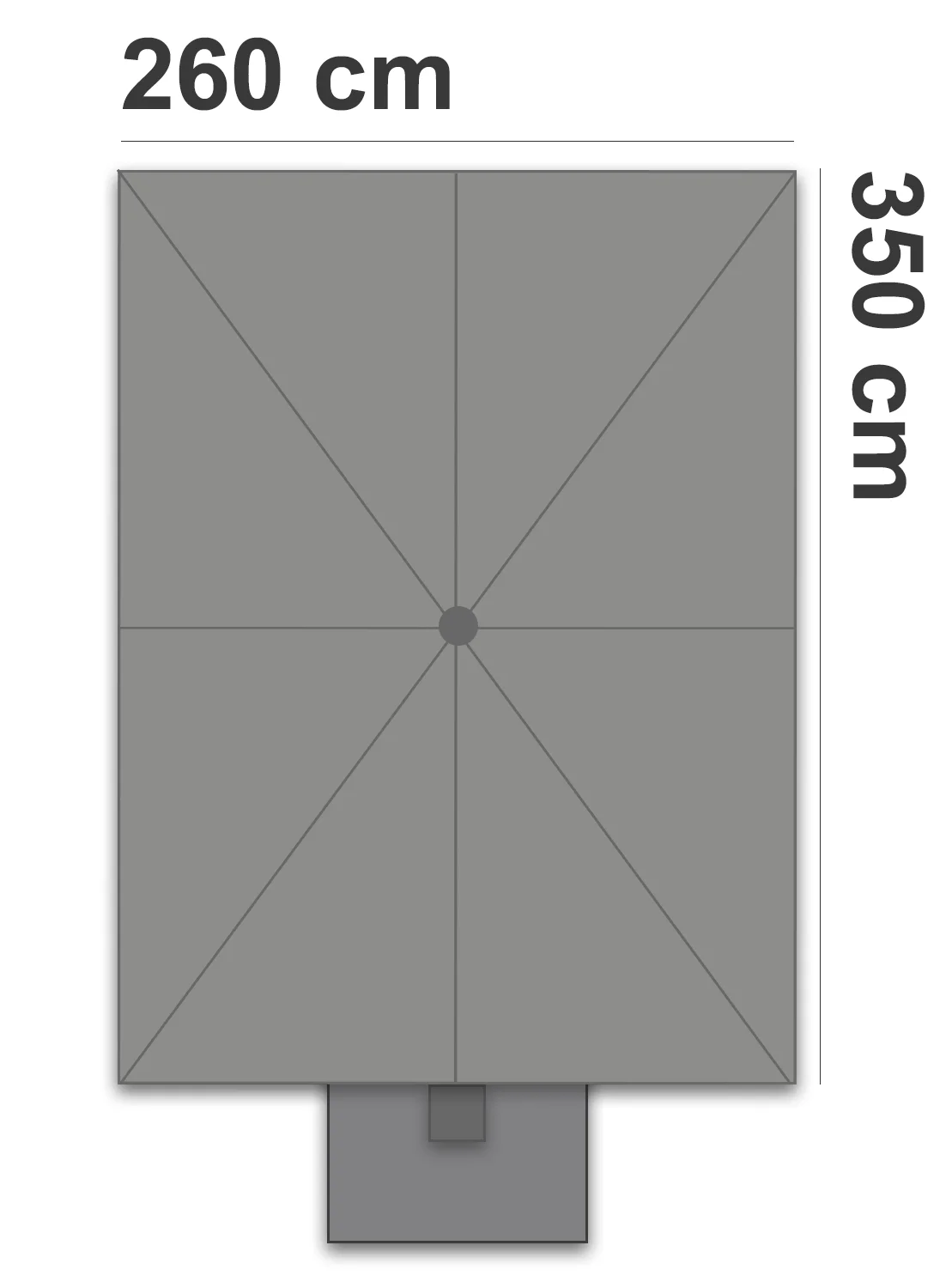 Detta parasoll har en rektangulär parasollduk. Kapellet är 260 cm brett och 350 cm djupt.