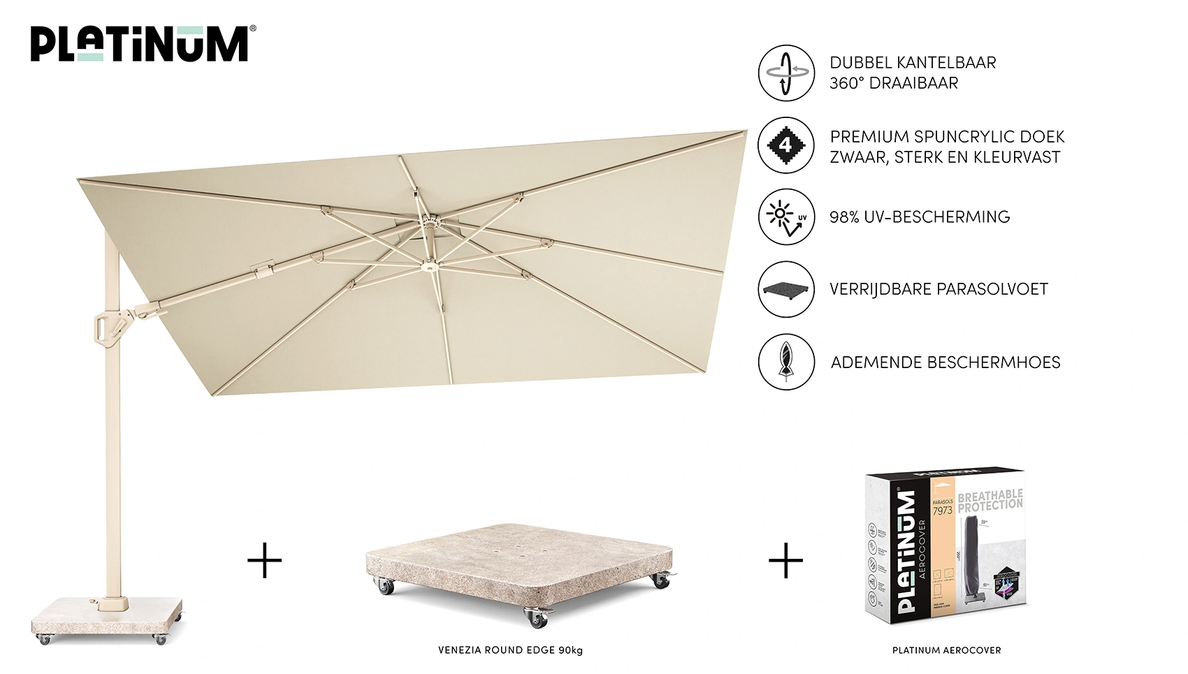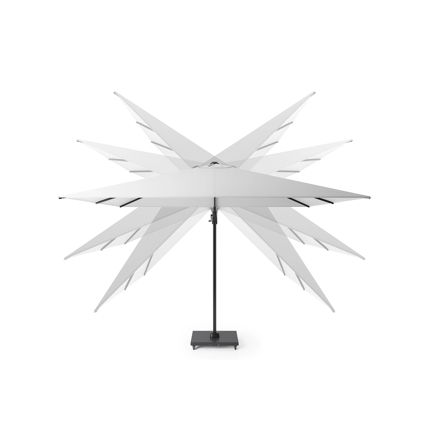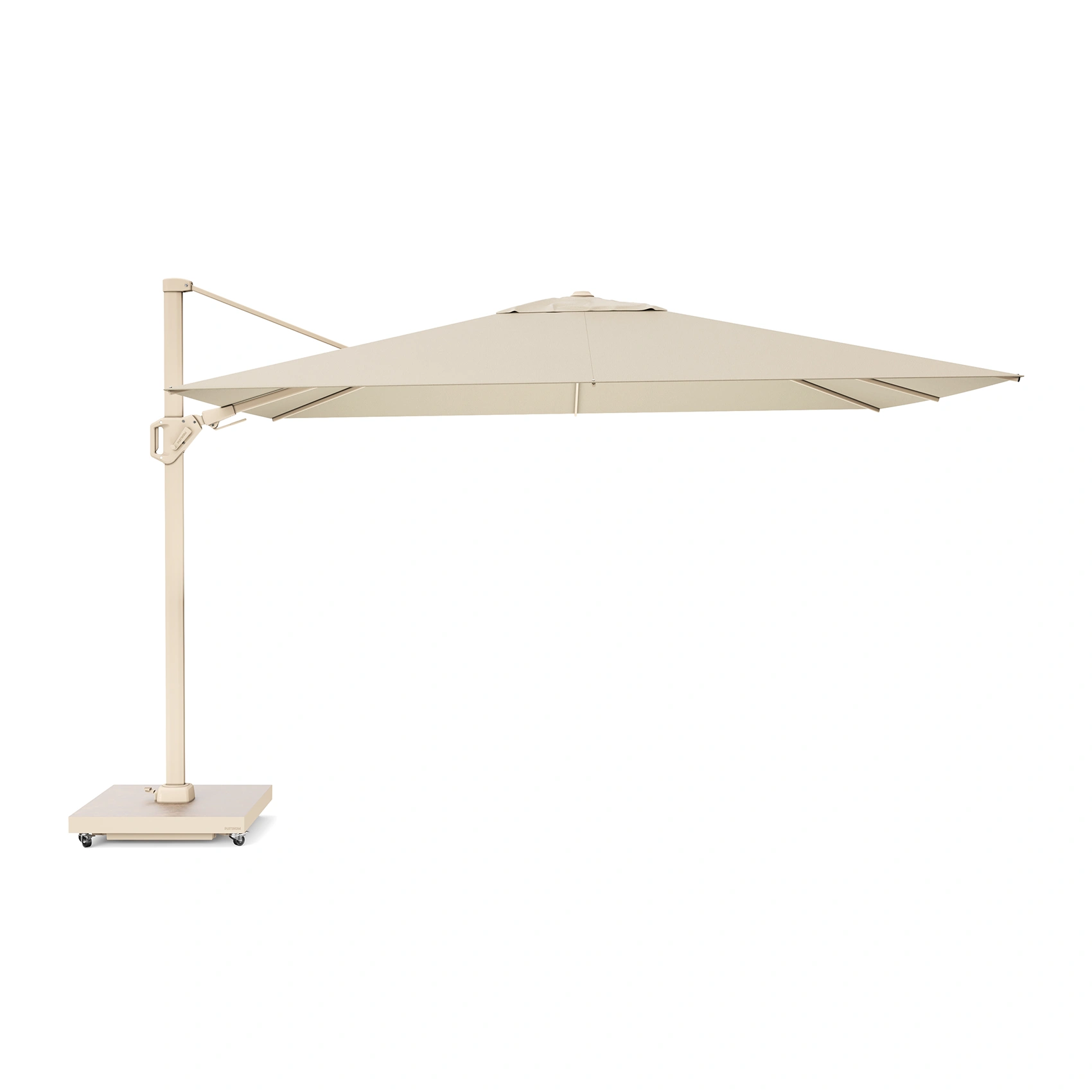 Parasollet levereras utan bas eller fotkryss. Parasollet kräver en parasollfotsvikt minst 90 kg. Vi rekommenderar att du placerar detta parasoll på en parasollfot från Platinum Sun & Shade. Dessa är försedda med hjul så att parasollet är lätt att flytta. Platinum Sun & Shade erbjuder även In-Ground parasollfötter som kan grävas ner eller gjutas fast i marken. Detta ger dig mer utrymme på din uteplats.