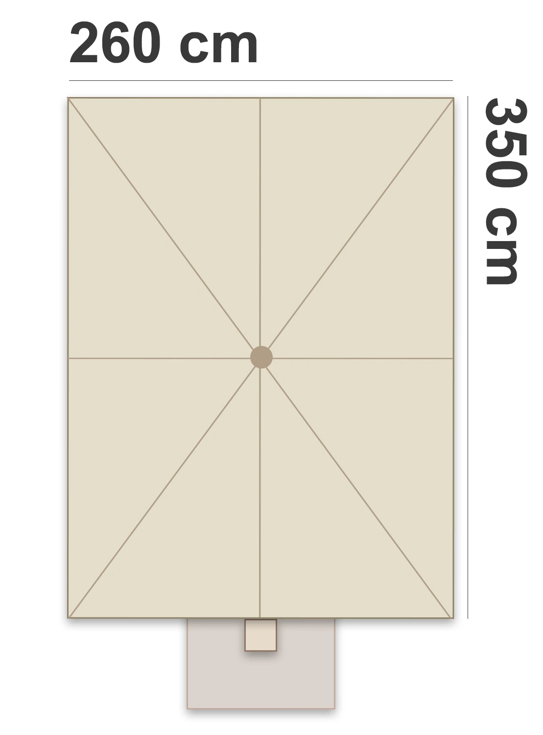 Detta parasoll har en rektangulär parasollduk. Kapellet är 260 cm brett och 350 cm djupt.