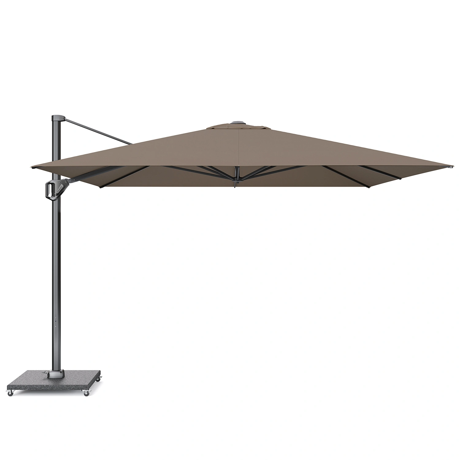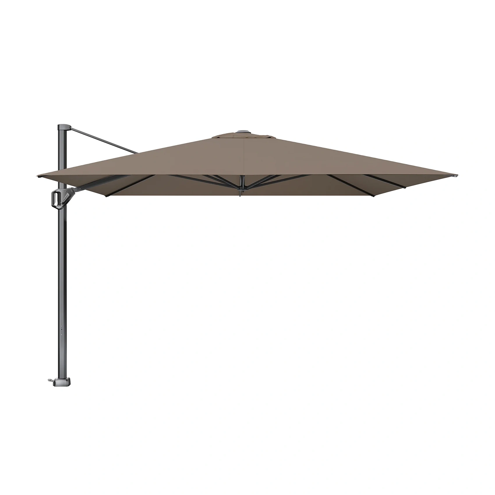 Challenger T¹ frihängande parasoll med teleskopstativ i antracitgrå aluminium och Premiumduk i färgen Havana.