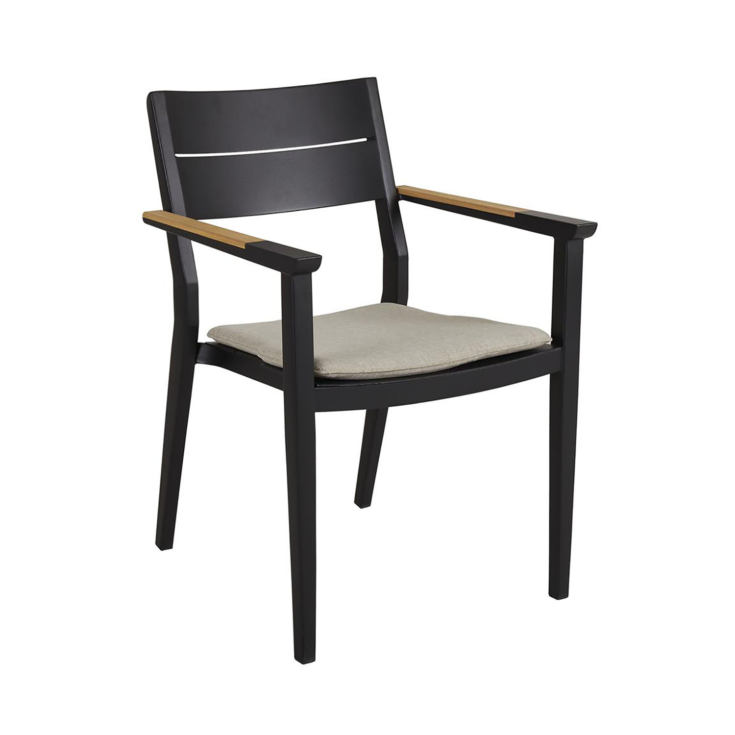Robust och bekväm karmstol (stapelbar) med formade armstöd med infälld teak. Måttanpassd sittdyna ingår. Sittdynan har dold fästning med gummistropp vilket gör att den hålls på sin plats.
