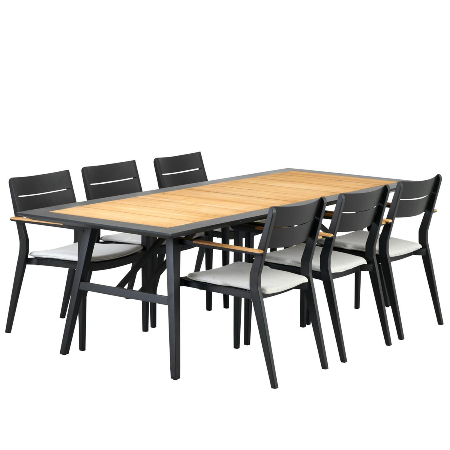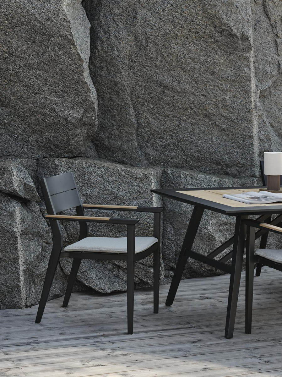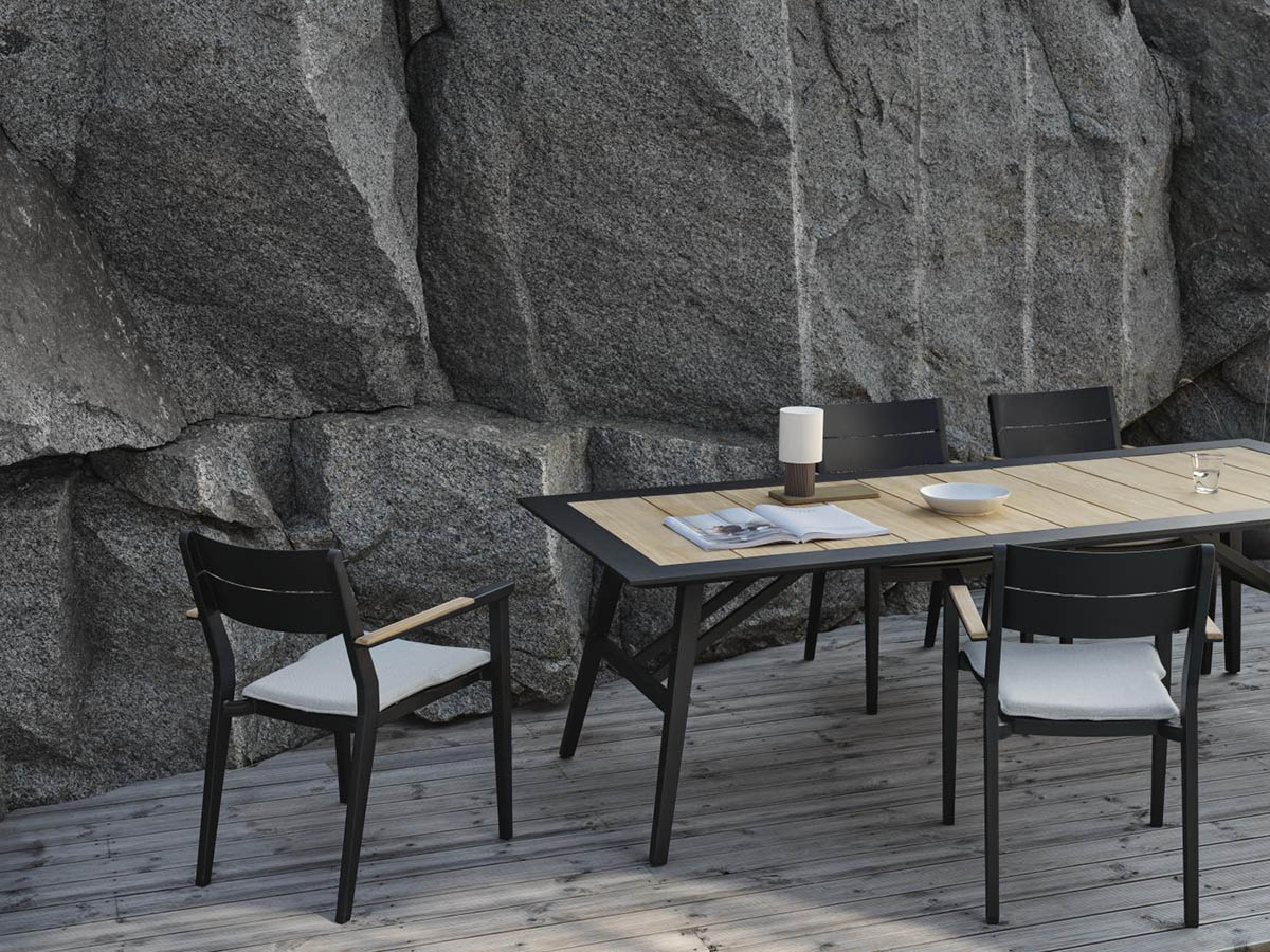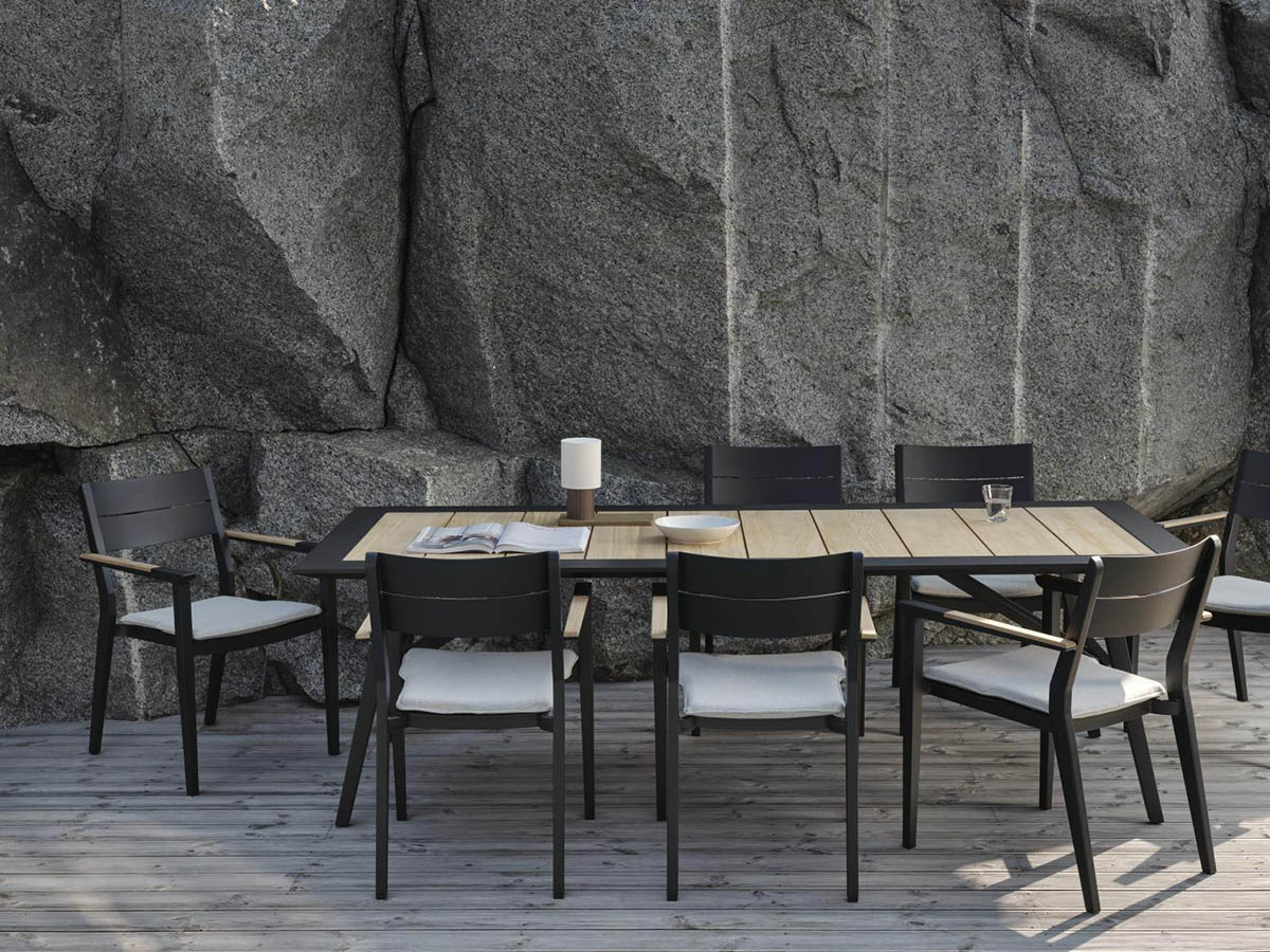 Chios är en vackert designad serie i teak och aluminium, som förgyller din matplats utomhus med sina rena linjer.