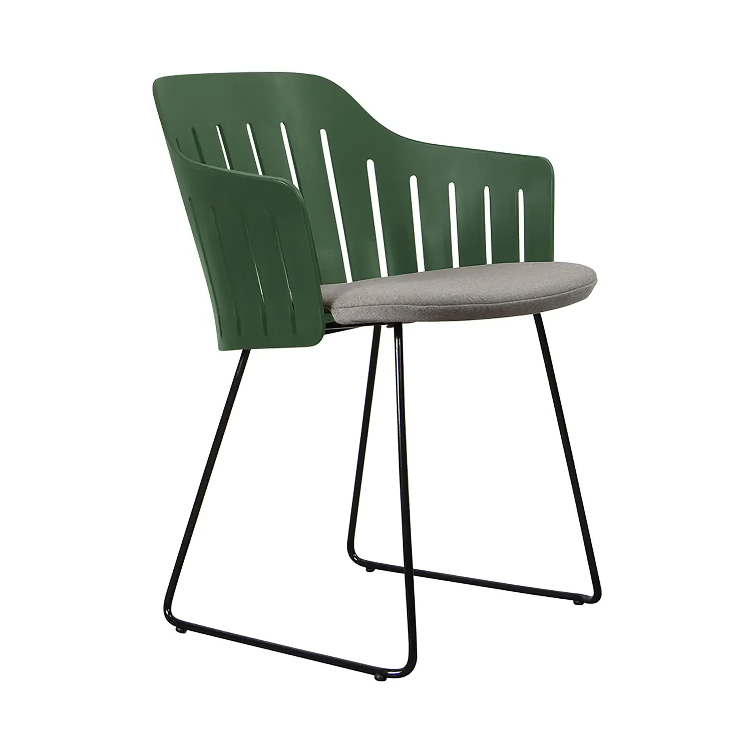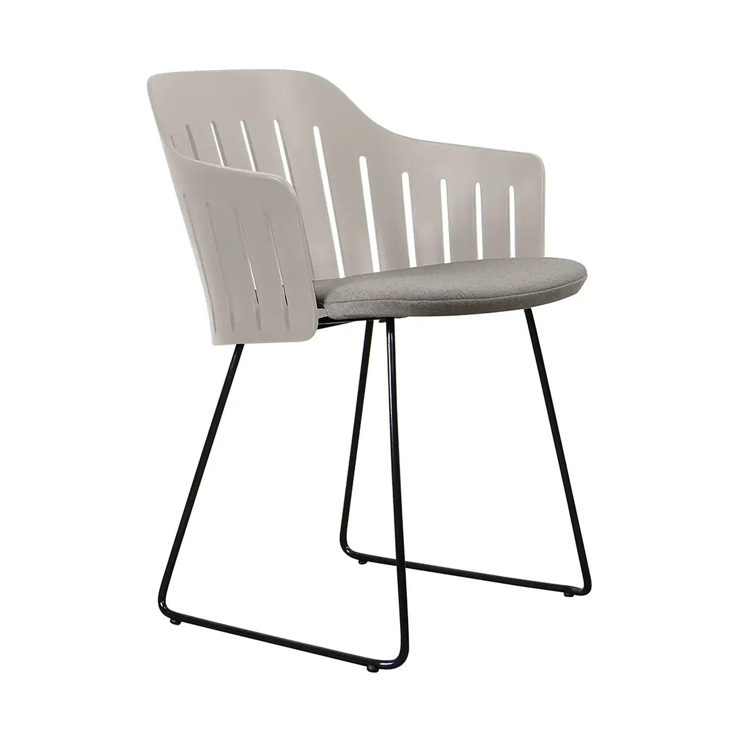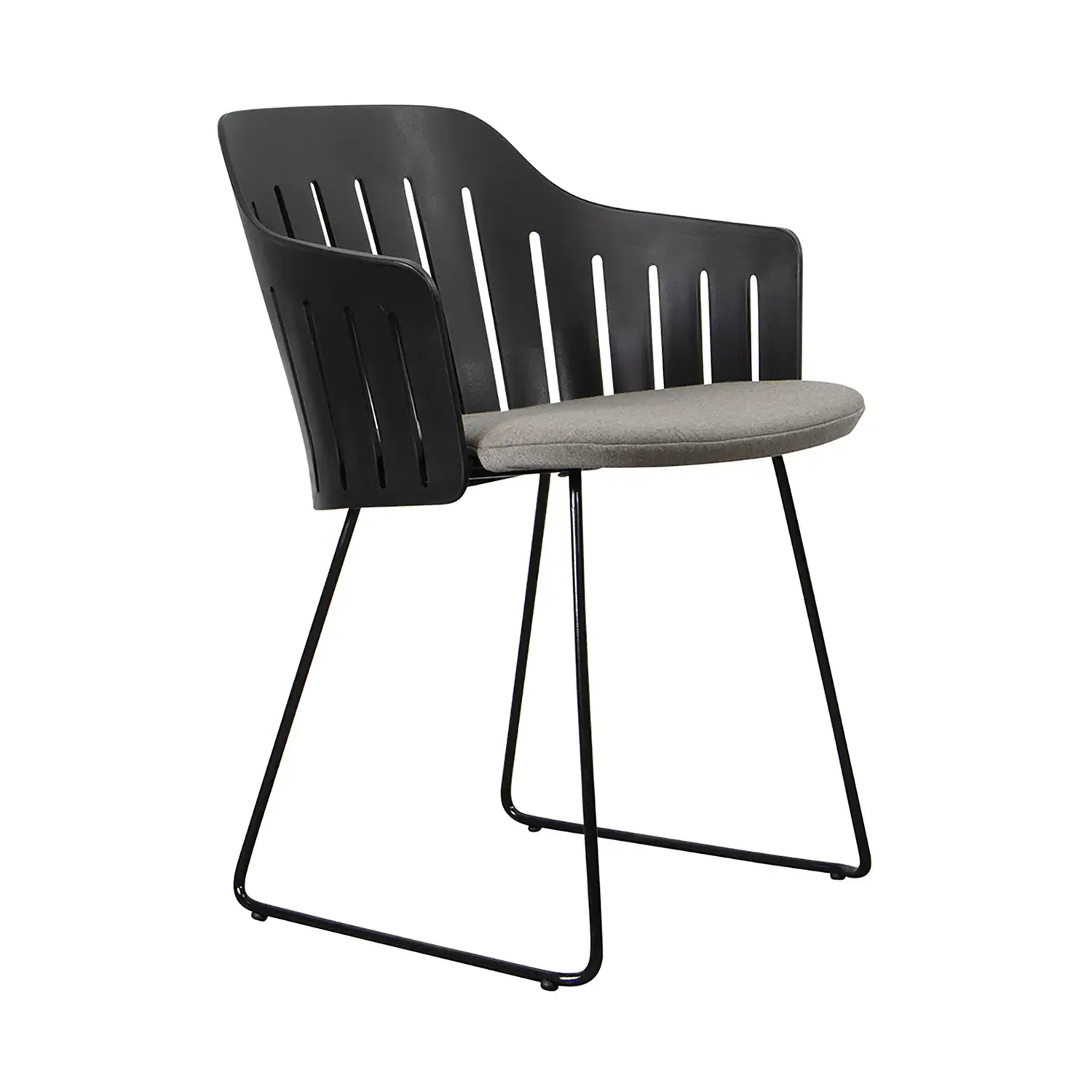 Choice matstol med avtagbar klädsel i Sunbrella-tyg. Sitsen är tillverkad i återvunnen polypropylen och underredet i svart varmgalvaniserat stål. Stolen kan även användas utan klädseln.