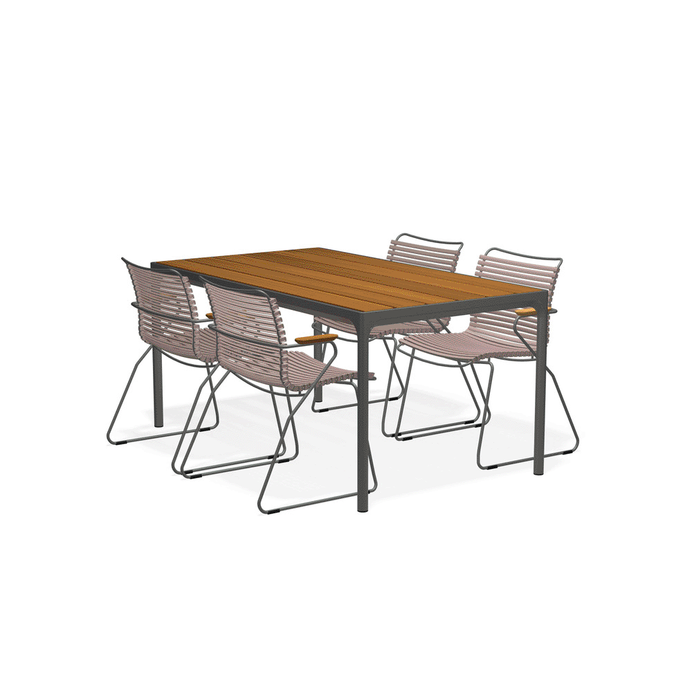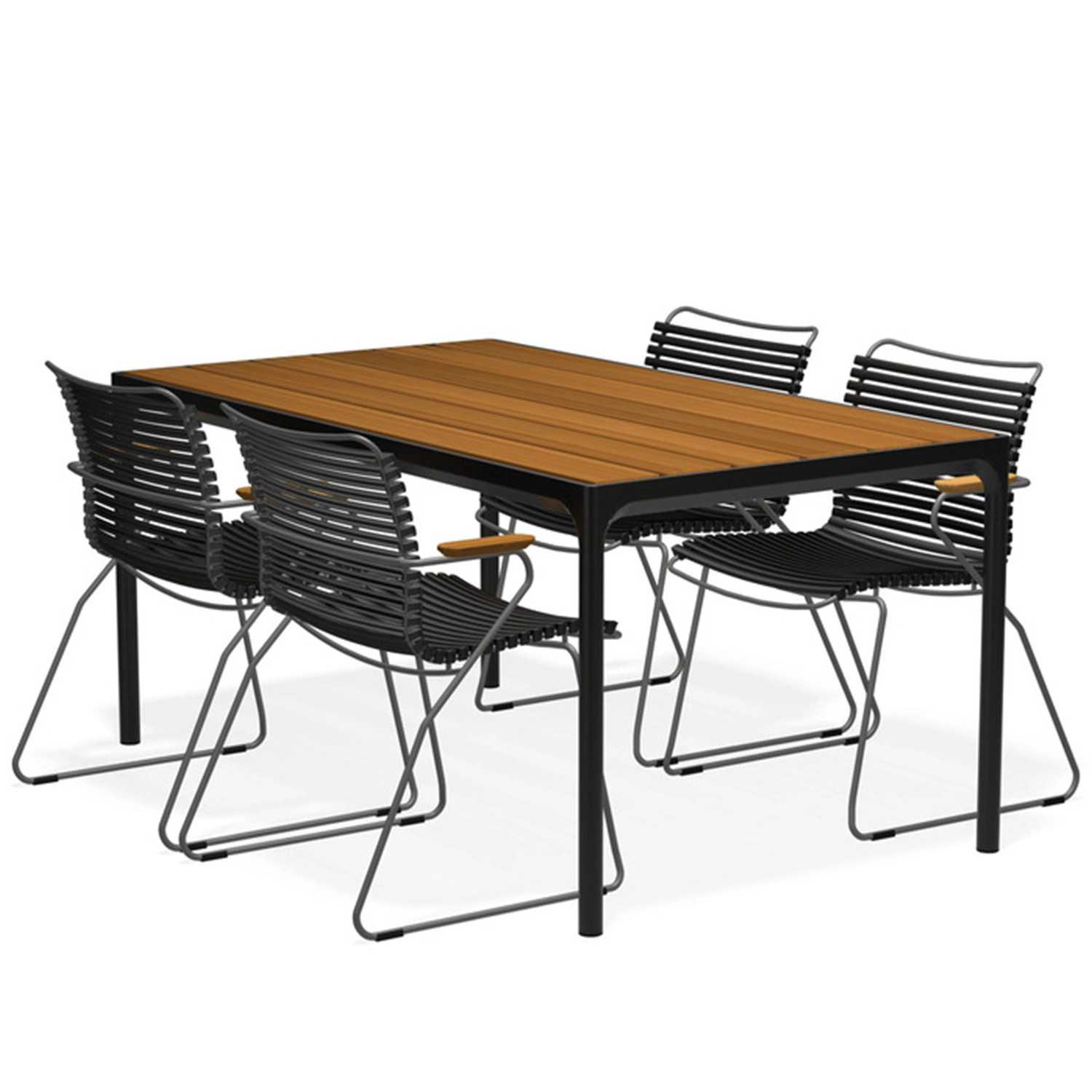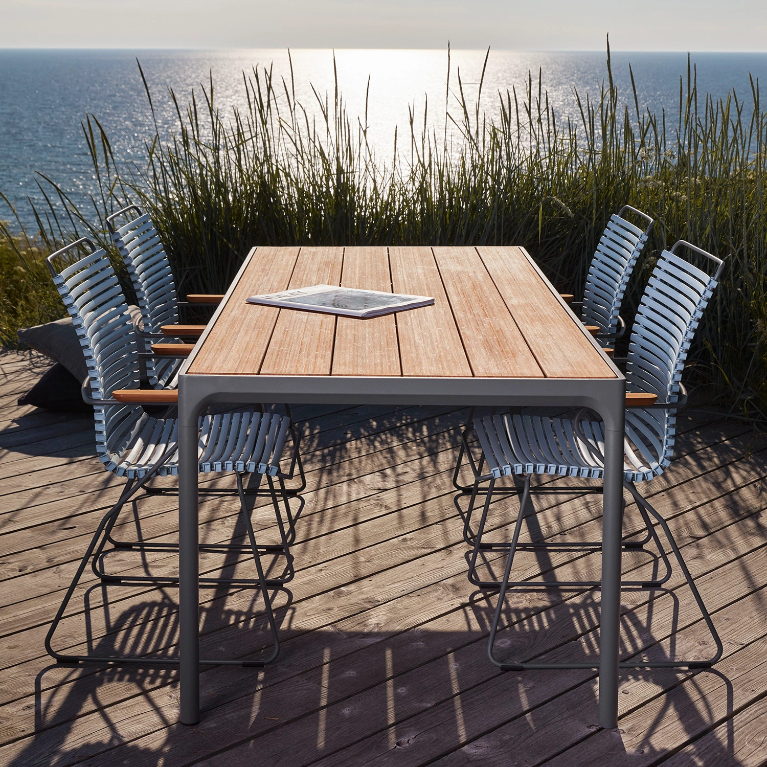 Matgrupp med fyra stycken Click-stolar och matbordet Four. Four är tillverkat i pulverlackerad aluminium med bordsskiva i bambu. Stolarna finns i många olika färger att välja emellan.