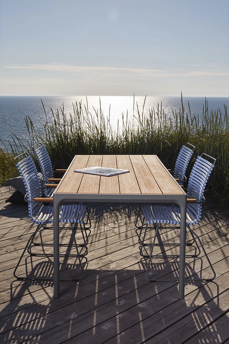 Lamellerna är utformade så att de sviktar precis lagom, därför behövs ingen dyna. Stolen är stapelbar och har armstöd av bambu. I samma möbelserie finns dessutom flera olika däckstolar och solstolar. Stolen kombineras med fördel till ett av Houes egna matbord.